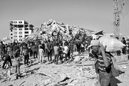 9月8日,人们在加沙城查看一座高层建筑遭以色列军队空袭后的废墟。新华社 图