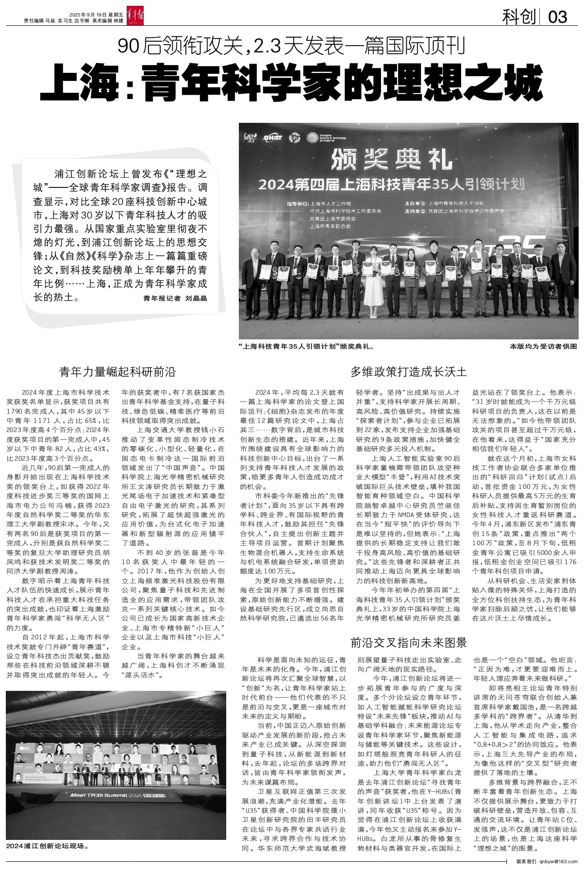 2024年,平均每2.3天就有一篇上海科学家的论文登上国际顶刊;《细胞》杂志发布的年度最佳12篇研究论文中,上海占其三……数字背后,是城市科技创新生态的搭建。近年来,上海市围绕建设具有全球影响力的科技创新中心目标,出台了一系列支持青年科技人才发展的政策,给更多青年人创造成功成才的机会。