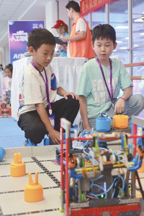 两名小选手参加AI智能协同赛道的比赛。青年报记者 施培琦 摄