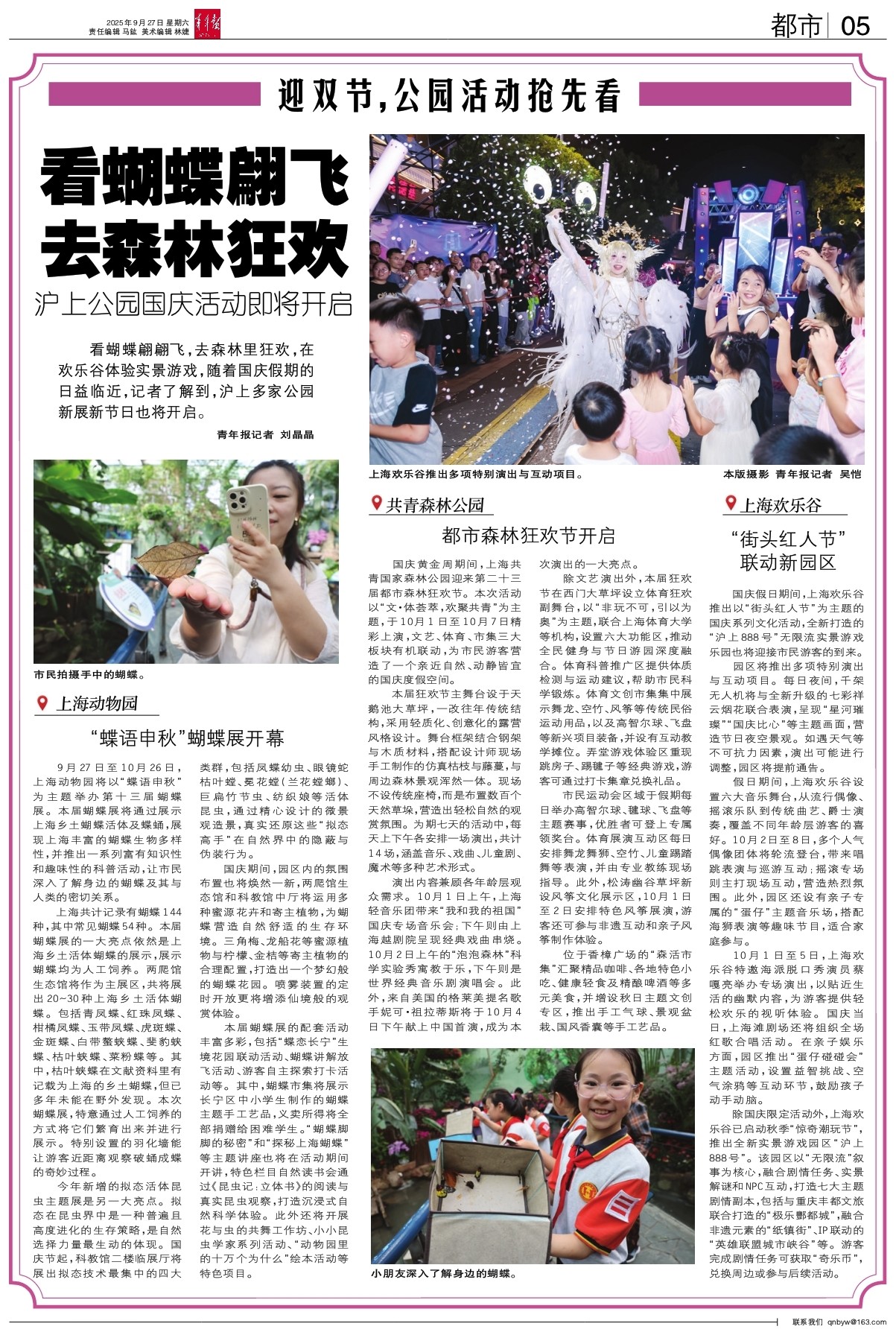 看蝴蝶翩翩飞,去森林里狂欢,在欢乐谷体验实景游戏,随着国庆假期的日益临近,记者了解到,沪上多家公园新展新节日也将开启。