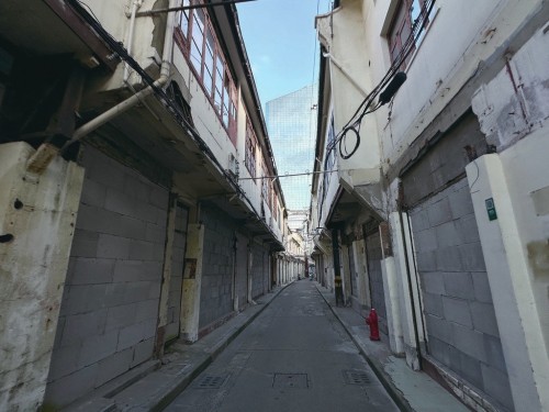 陈寒松将起点定在浙江中路天津路路口,几米开外就看到了香粉弄的路牌。拐进这条紧贴着南京东路步行街北侧商家后门的弄堂,在傍晚时分只听到餐饮店后厨排风机忙碌的声音,消散数十年的脂粉气早已无处可寻。陈寒松记得前几次来都会路过一家小龙虾店,笑称十三香也算得上是“香粉”。果不其然,依旧营业的店铺香气扑鼻,恰巧呼应了路牌上的“香”字。