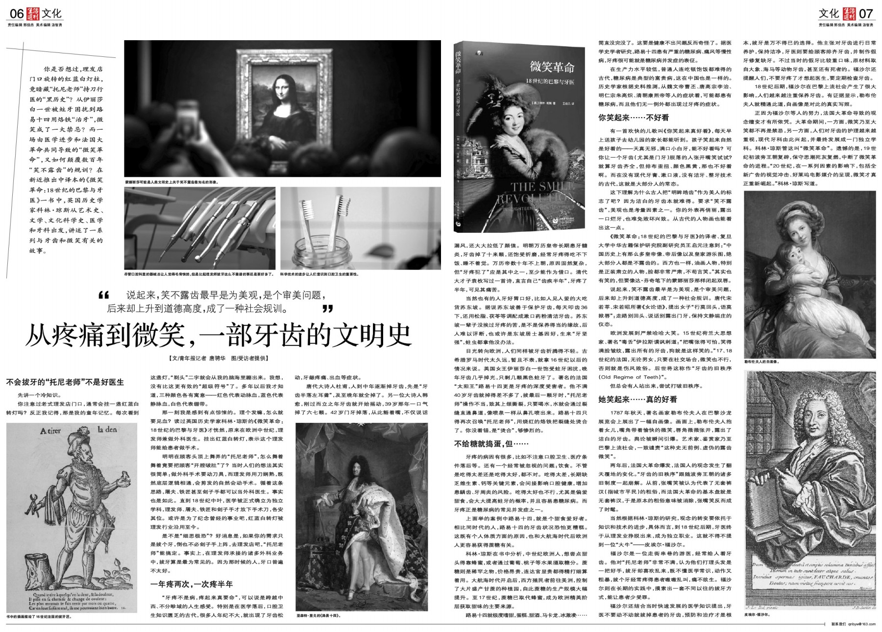 你是否想过,理发店门口旋转的红蓝白灯柱,竟暗藏“托尼老师”持刀行医的“黑历史”?从伊丽莎白一世被蛀牙困扰到路易十四用烙铁“治牙”,微笑成了一大禁忌?而一场由医学进步和法国大革命共同导致的“微笑革命”,又如何颠覆数百年“笑不露齿”的规训?在新近推出中译本的《微笑革命:18世纪的巴黎与牙医》一书中,英国历史学家科林·琼斯从艺术史、文学、文化科学史、医学和牙科出发,讲述了一系列与牙齿和微笑有关的故事。