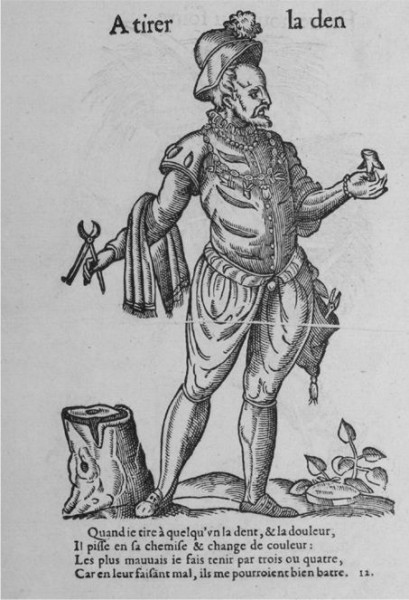 书中的插画描绘了16世纪法国的拔牙匠。