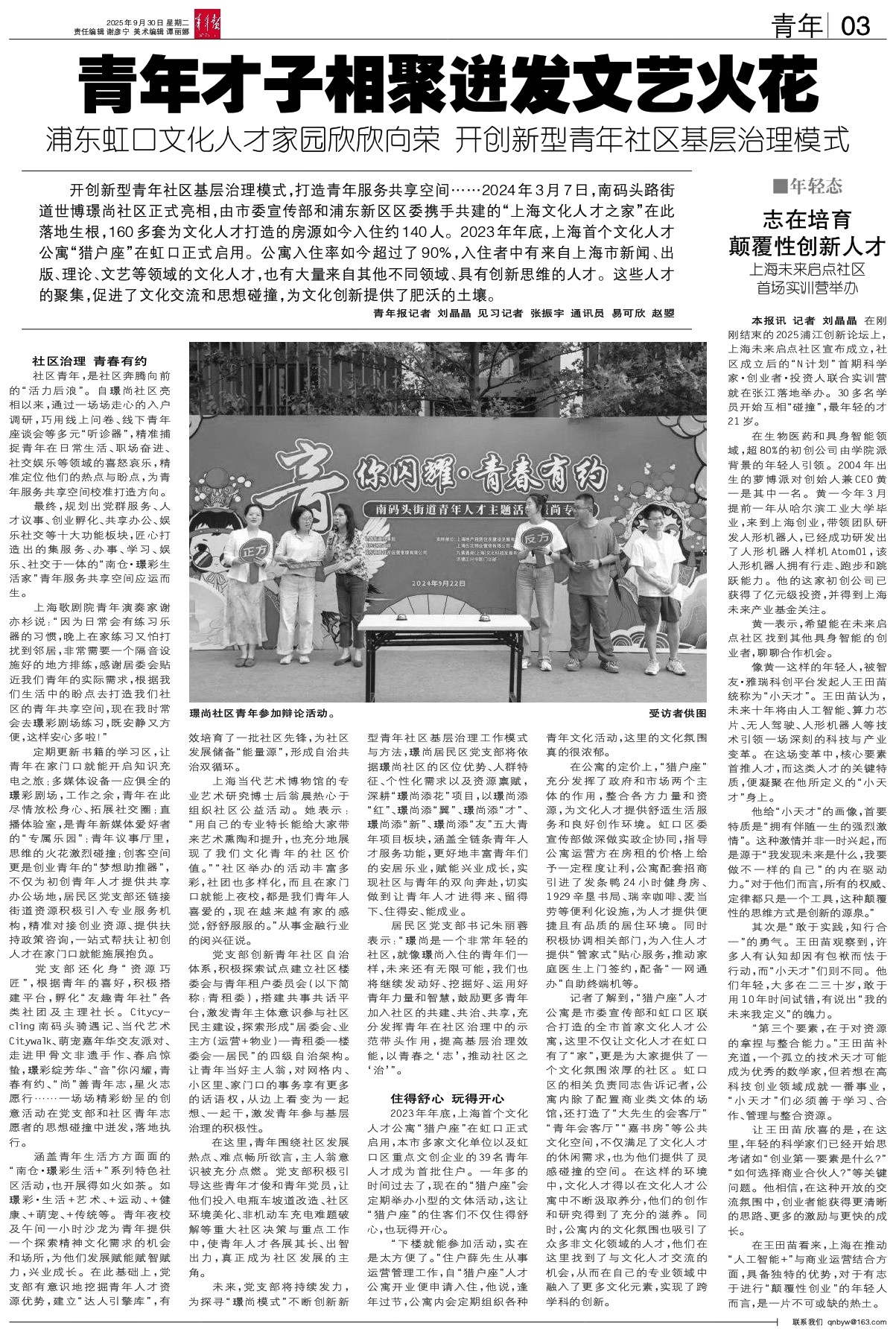 开创新型青年社区基层治理模式,打造青年服务共享空间……2024年3月7日,南码头路街道世博璟尚社区正式亮相,由市委宣传部和浦东新区区委携手共建的“上海文化人才之家”在此落地生根,160多套为文化人才打造的房源如今入住约140人。2023年年底,上海首个文化人才公寓“猎户座”在虹口正式启用。公寓入住率如今超过了90%,入住者中有来自上海市新闻、出版、理论、文艺等领域的文化人才,也有大量来自其他不同领域、具有创新思维的人才。这些人才的聚集,促进了文化交流和思想碰撞,为文化创新提供了肥沃的土壤。