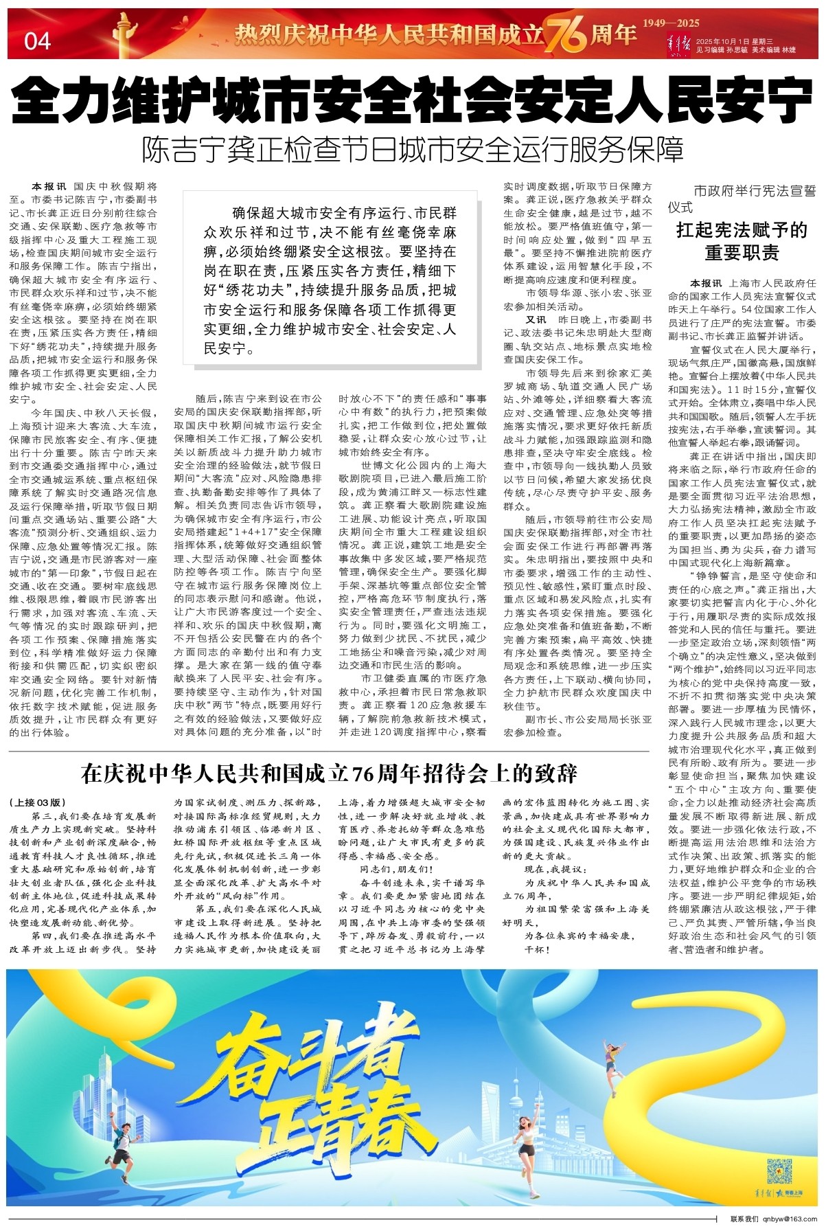 龚正在讲话中指出,国庆即将来临之际,举行市政府任命的国家工作人员宪法宣誓仪式,就是要全面贯彻习近平法治思想,大力弘扬宪法精神,激励全市政府工作人员坚决扛起宪法赋予的重要职责,以更加昂扬的姿态为国担当、勇为尖兵,奋力谱写中国式现代化上海新篇章。