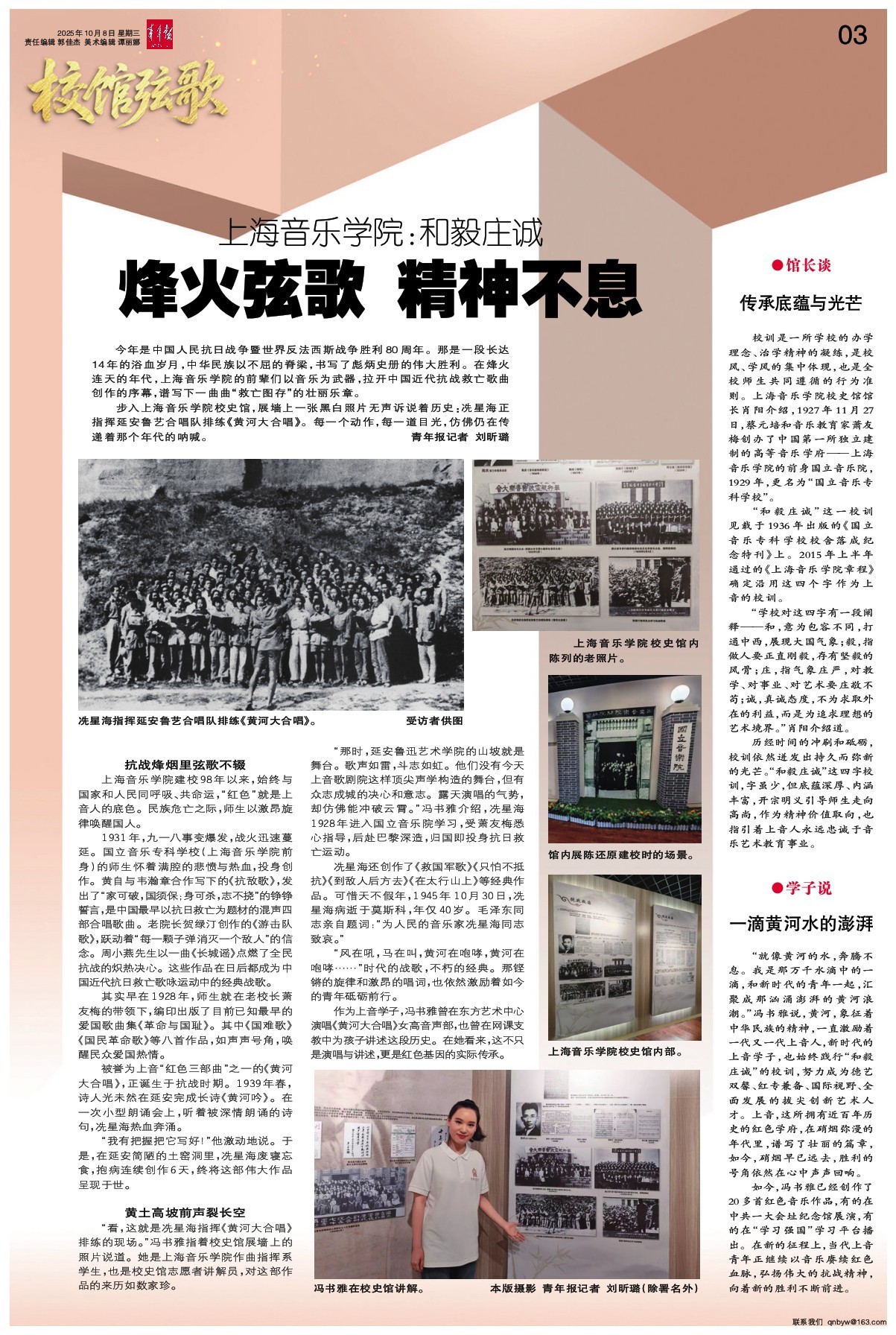 如今,冯书雅已经创作了20多首红色音乐作品,有的在中共一大会址纪念馆展演,有的在“学习强国”学习平台播出。在新的征程上,当代上音青年正继续以音乐赓续红色血脉,弘扬伟大的抗战精神,向着新的胜利不断前进。