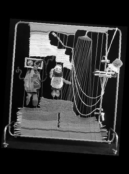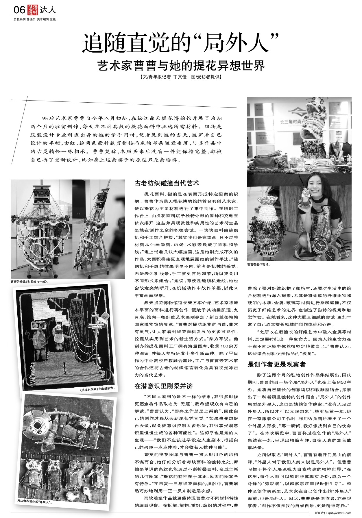 95后艺术家曹曹自今年八月初起,在松江鼎天提花博物馆开展了为期两个月的驻留创作,每天在不计其数的提花面料中挑选所需材料。织物是服装设计专业科班出身的她的拿手用材,记者见到她的当天,她穿着自己设计的半裙,由红、粉两色面料裁剪拼接而成的布条随意垂落,与其作品中的古灵精怪一脉相承。曹曹笑称,衣服买来后没有一件能保持完整,都被自己拆了重新设计,比如身上这条裙子的原型只是条睡裤。