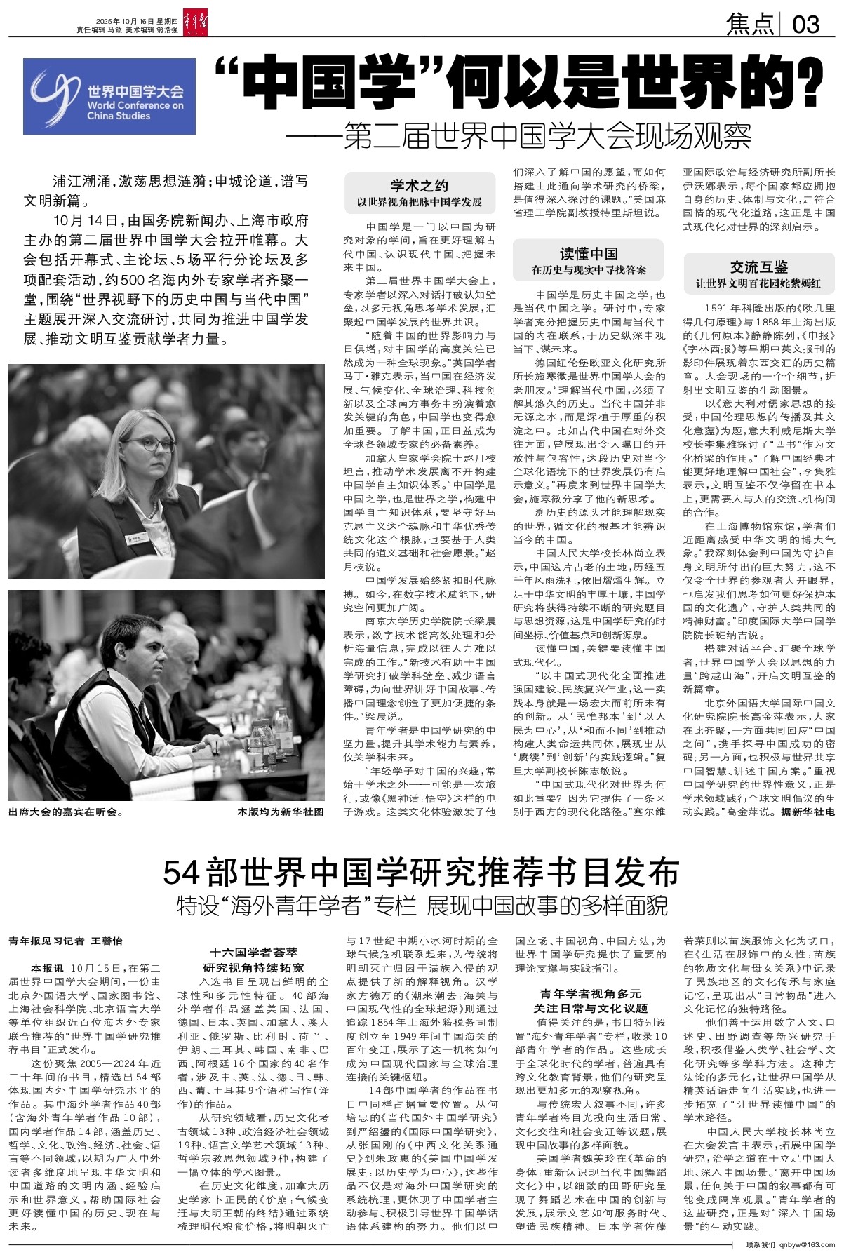 10月14日,由国务院新闻办、上海市政府主办的第二届世界中国学大会拉开帷幕。大会包括开幕式、主论坛、5场平行分论坛及多项配套活动,约500名海内外专家学者齐聚一堂,围绕“世界视野下的历史中国与当代中国”主题展开深入交流研讨,共同为推进中国学发展、推动文明互鉴贡献学者力量。