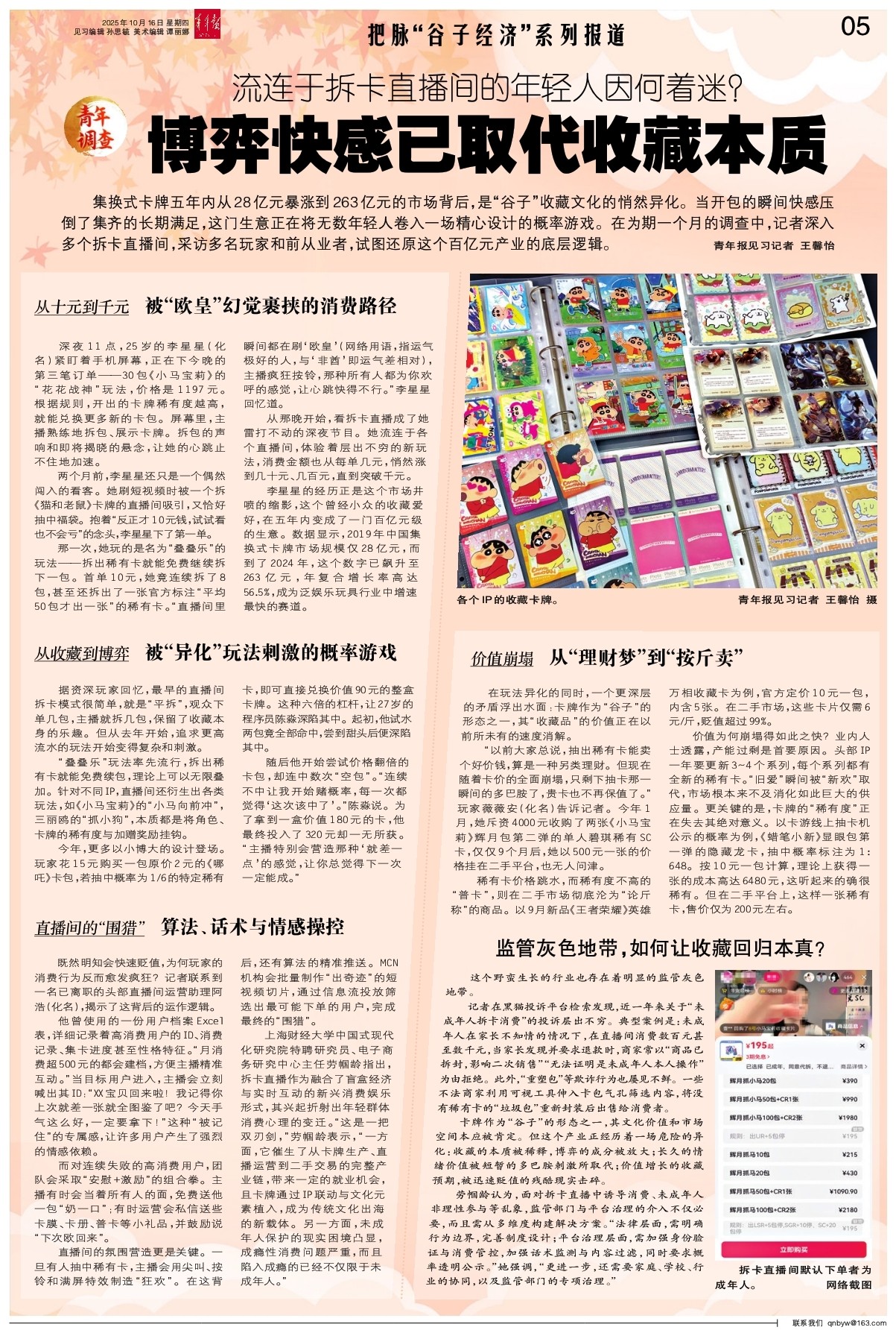 集换式卡牌五年内从28亿元暴涨到263亿元的市场背后,是“谷子”收藏文化的悄然异化。当开包的瞬间快感压倒了集齐的长期满足,这门生意正在将无数年轻人卷入一场精心设计的概率游戏。在为期一个月的调查中,记者深入多个拆卡直播间,采访多名玩家和前从业者,试图还原这个百亿元产业的底层逻辑。