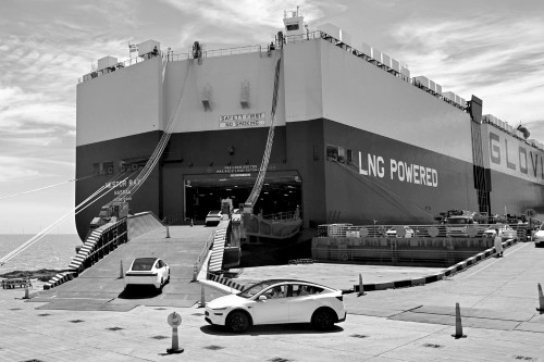 2025年7月2日,在上海自贸区临港新片区南港码头,一批新能源汽车驶向一艘滚装货轮。新华社 图
