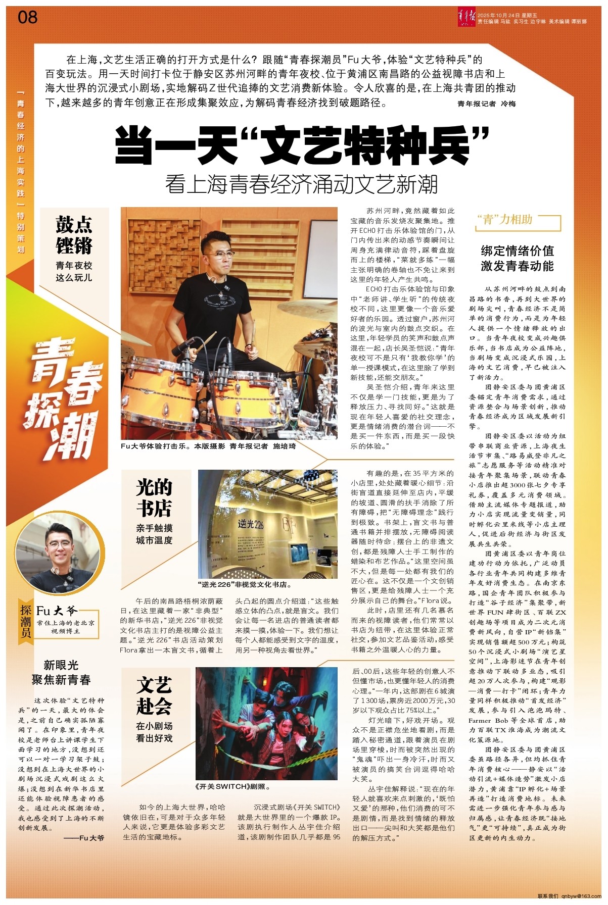 在上海,文艺生活正确的打开方式是什么?跟随“青春探潮员”Fu大爷,体验“文艺特种兵”的百变玩法。用一天时间打卡位于静安区苏州河畔的青年夜校、位于黄浦区南昌路的公益视障书店和上海大世界的沉浸式小剧场,实地解码Z世代追捧的文艺消费新体验。令人欣喜的是,在上海共青团的推动下,越来越多的青年创意正在形成集聚效应,为解码青春经济找到破题路径。