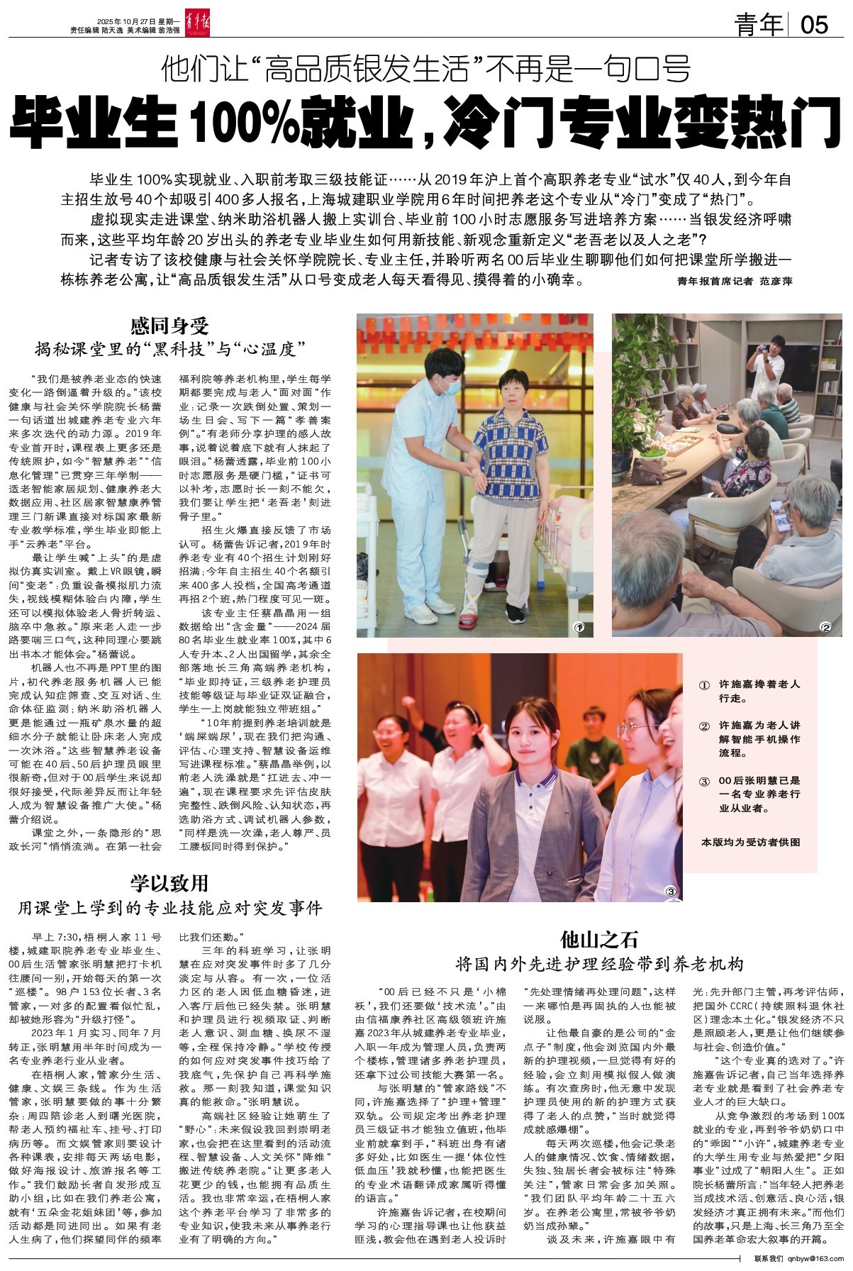 毕业生100%实现就业、入职前考取三级技能证……从2019年沪上首个高职养老专业“试水”仅40人,到今年自主招生放号40个却吸引400多人报名,上海城建职业学院用6年时间把养老这个专业从“冷门”变成了“热门”。