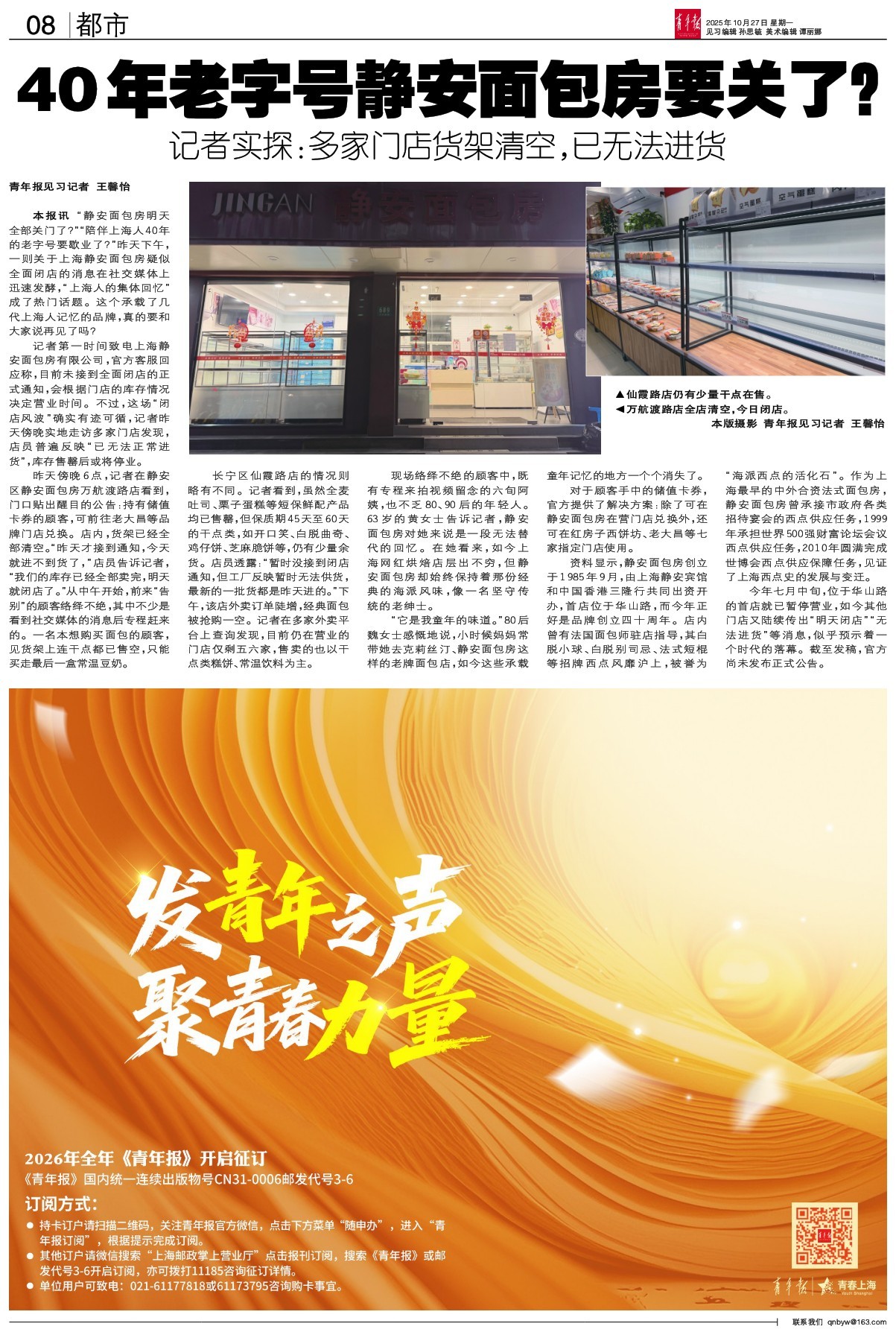 昨天傍晚6点,记者在静安区静安面包房万航渡路店看到,门口贴出醒目的公告:持有储值卡券的顾客,可前往老大昌等品牌门店兑换。店内,货架已经全部清空。“昨天才接到通知,今天就进不到货了,”店员告诉记者,“我们的库存已经全部卖完,明天就闭店了。”从中午开始,前来“告别”的顾客络绎不绝,其中不少是看到社交媒体的消息后专程赶来的。一名本想购买面包的顾客,见货架上连干点都已售空,只能买走最后一盒常温豆奶。