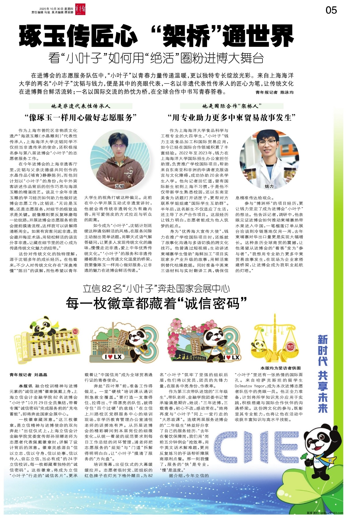 一枚徽章藏深意。“这三枚徽章,是立信精神与进博使命的双向奔赴!”出征仪式上,上海立信会计金融学院党委宣传部孙丽娜老师为志愿者代表佩戴徽章时,详解了设计背后的深意。徽章灵感源自“信以立志、信以守身、信以处事、信以待人、毋忘立信、当必有成”的24字立信校训,每一枚都藏着独特的“诚信密码”。这些徽章,将成为立信“小叶子”行走的“诚信名片”,更承载着让“中国信用”成为全球贸易通行证的青春使命。