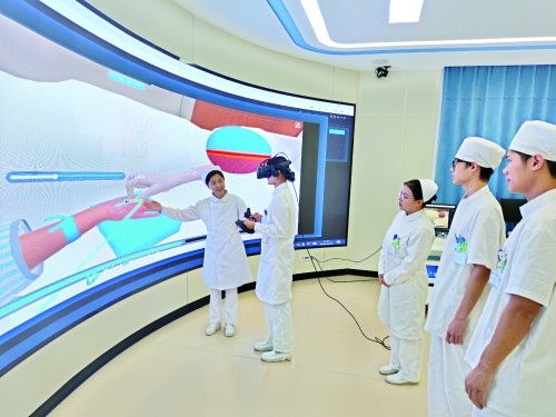 “以前同学互扎,或者拿自己练手,怕疼更怕扎错。现在有虚拟仿真基地,问题迎刃而解。在虚拟仿真实训室,机器手臂的触感、血管走向与真人几乎一致,进针瞬间电脑同步监测,角度稍有偏差立刻语音提示,真实度高达95%。”日前,潘美娟带领记者走进济光虚拟仿真实训中心。早在2021年,这里就获批“上海市高等职业院校示范性虚拟仿真实训基地”。