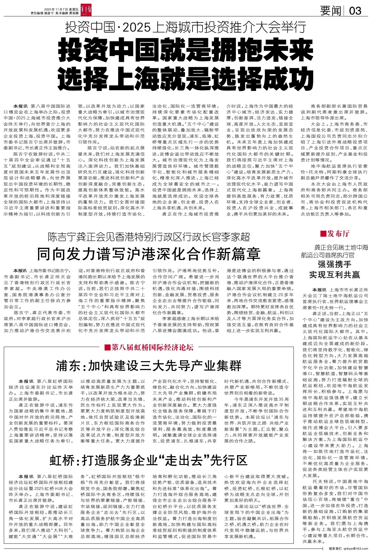 龚正在致辞中说,浦东作为国家战略的集中承载地,是中国对外开放的前沿阵地、产业创新发展的重要标杆。要深入贯彻落实习近平总书记考察上海重要讲话精神,坚持以落实国家重大战略任务为牵引,以推动高质量发展为主题,以培育发展新质生产力为重要抓手,以改革开放为根本动力,努力在经济挑大梁、改革当先锋、民生作标杆上实现更大作为。要更大力度构筑制度型开放高地,依托自贸试验区及临港新片区、东方枢纽国际商务合作区等开放平台,深化落实综合改革试点方案、制度型开放方案等重大任务。更大力度提升产业现代化水平,坚持智能化、绿色化、融合化方向,加快建设三大先导产业集群,前瞻布局未来产业,推动科技创新和产业创新深度融合。更大力度强化全链条服务保障,着眼于打造市场化、法治化、国际化的一流营商环境,努力做到投资最便利、服务最高效、制度最透明。诚挚邀请全球企业选择浦东、投资浦东、扎根浦东,共享时代新机遇、共创合作新模式、共塑产业新格局,不断创造令世界刮目相看的新奇迹。