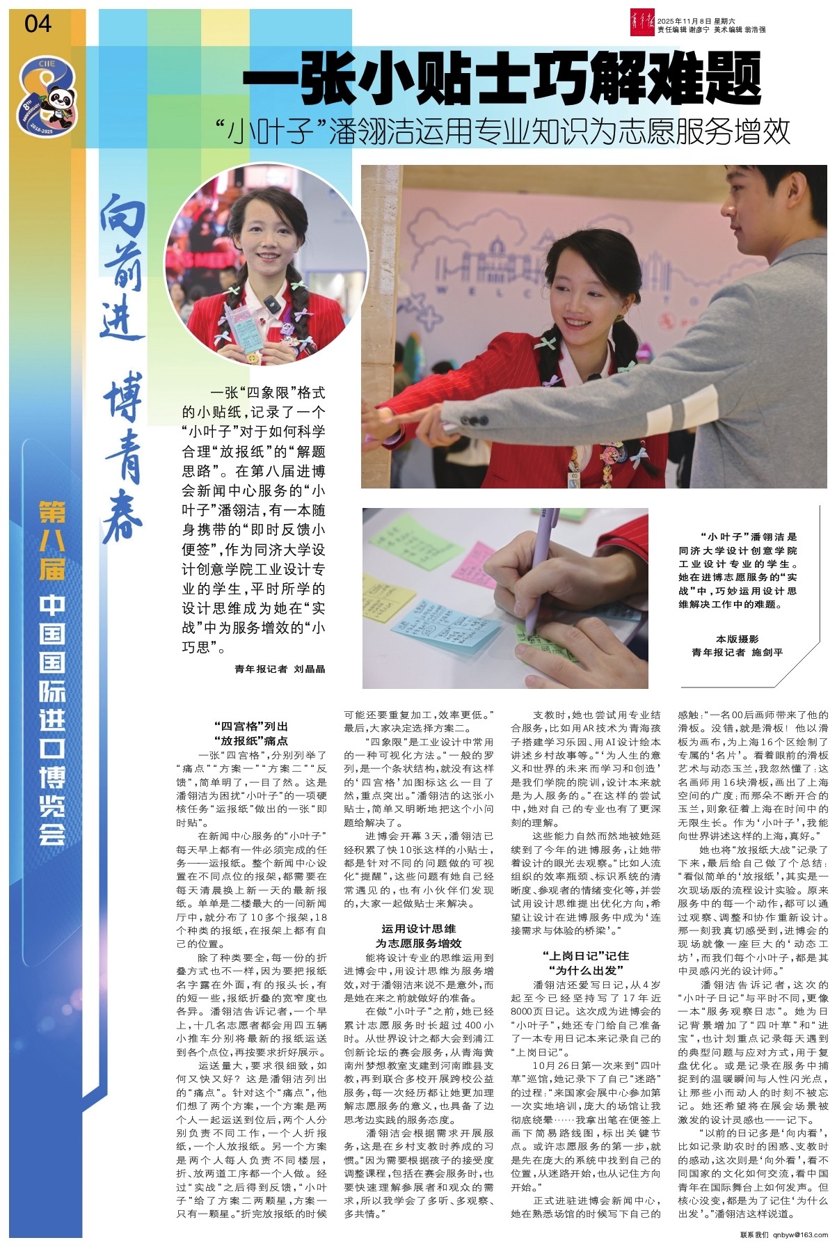 一张“四象限”格式的小贴纸,记录了一个“小叶子”对于如何科学合理“放报纸”的“解题思路”。在第八届进博会新闻中心服务的“小叶子”潘翎洁,有一本随身携带的“即时反馈小便签”,作为同济大学设计创意学院工业设计专业的学生,平时所学的设计思维成为她在“实战”中为服务增效的“小巧思”。