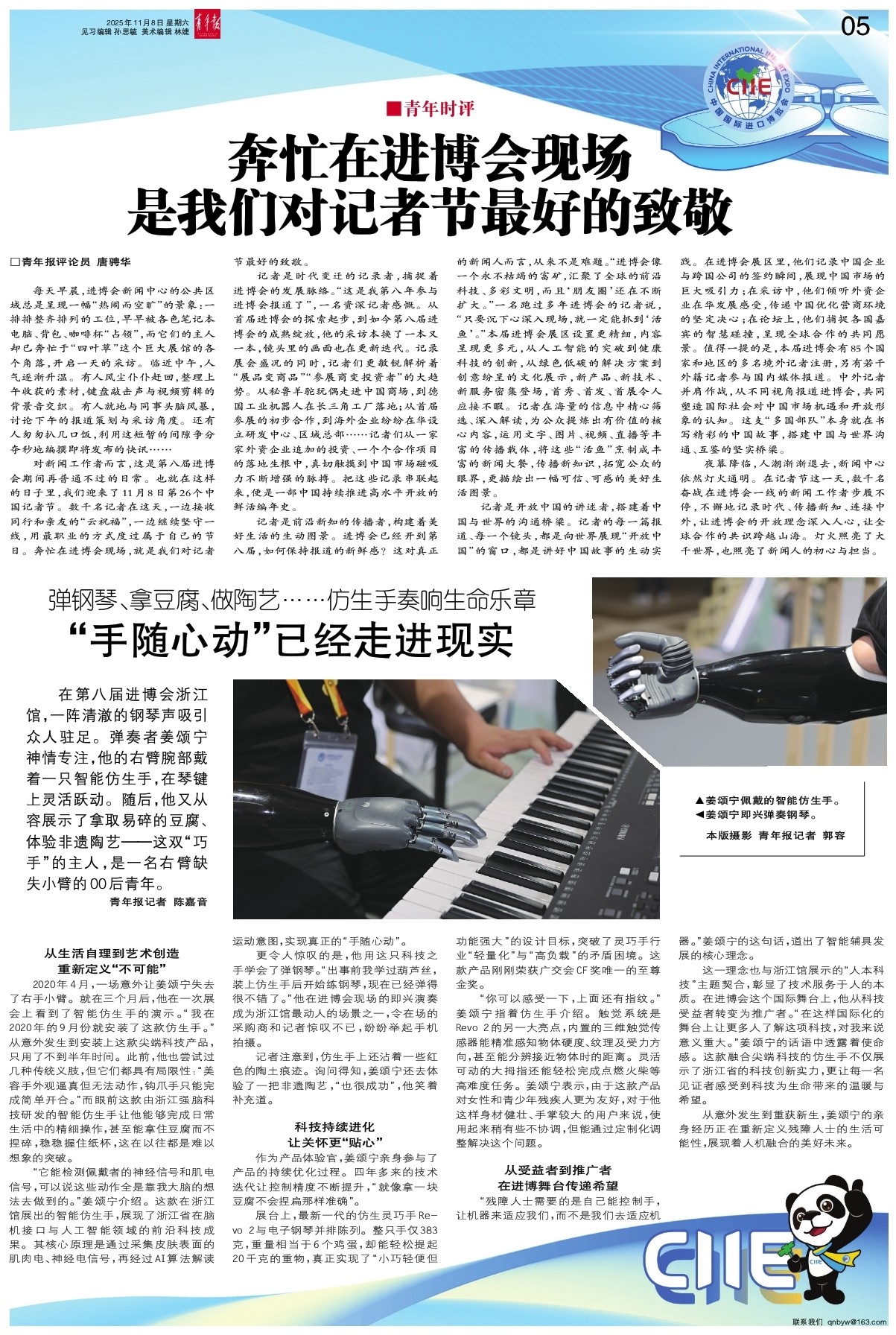 记者是前沿新知的传播者,构建着美好生活的生动图景。进博会已经开到第八届,如何保持报道的新鲜感?这对真正的新闻人而言,从来不是难题。“进博会像一个永不枯竭的富矿,汇聚了全球的前沿科技、多彩文明,而且‘朋友圈’还在不断扩大。”一名跑过多年进博会的记者说,“只要沉下心深入现场,就一定能抓到‘活鱼’。”本届进博会展区设置更精细,内容呈现更多元,从人工智能的突破到健康科技的创新,从绿色低碳的解决方案到创意纷呈的文化展示,新产品、新技术、新服务密集登场,首秀、首发、首展令人应接不暇。记者在海量的信息中精心筛选、深入解读,为公众提炼出有价值的核心内容,运用文字、图片、视频、直播等丰富的传播载体,将这些“活鱼”烹制成丰富的新闻大餐,传播新知识,拓宽公众的眼界,更描绘出一幅可信、可感的美好生活图景。