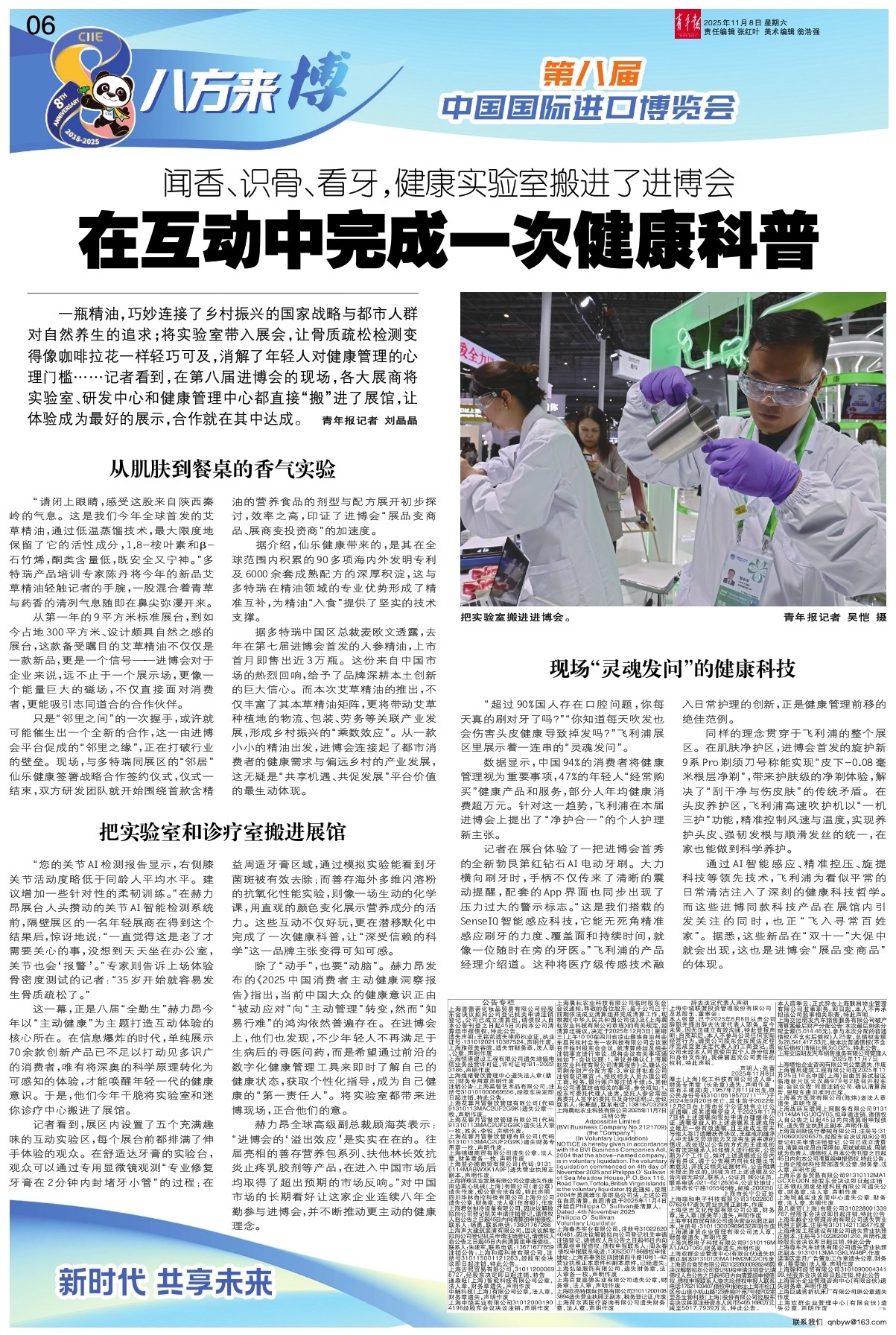 一瓶精油,巧妙连接了乡村振兴的国家战略与都市人群对自然养生的追求;将实验室带入展会,让骨质疏松检测变得像咖啡拉花一样轻巧可及,消解了年轻人对健康管理的心理门槛……记者看到,在第八届进博会的现场,各大展商将实验室、研发中心和健康管理中心都直接“搬”进了展馆,让体验成为最好的展示,合作就在其中达成。