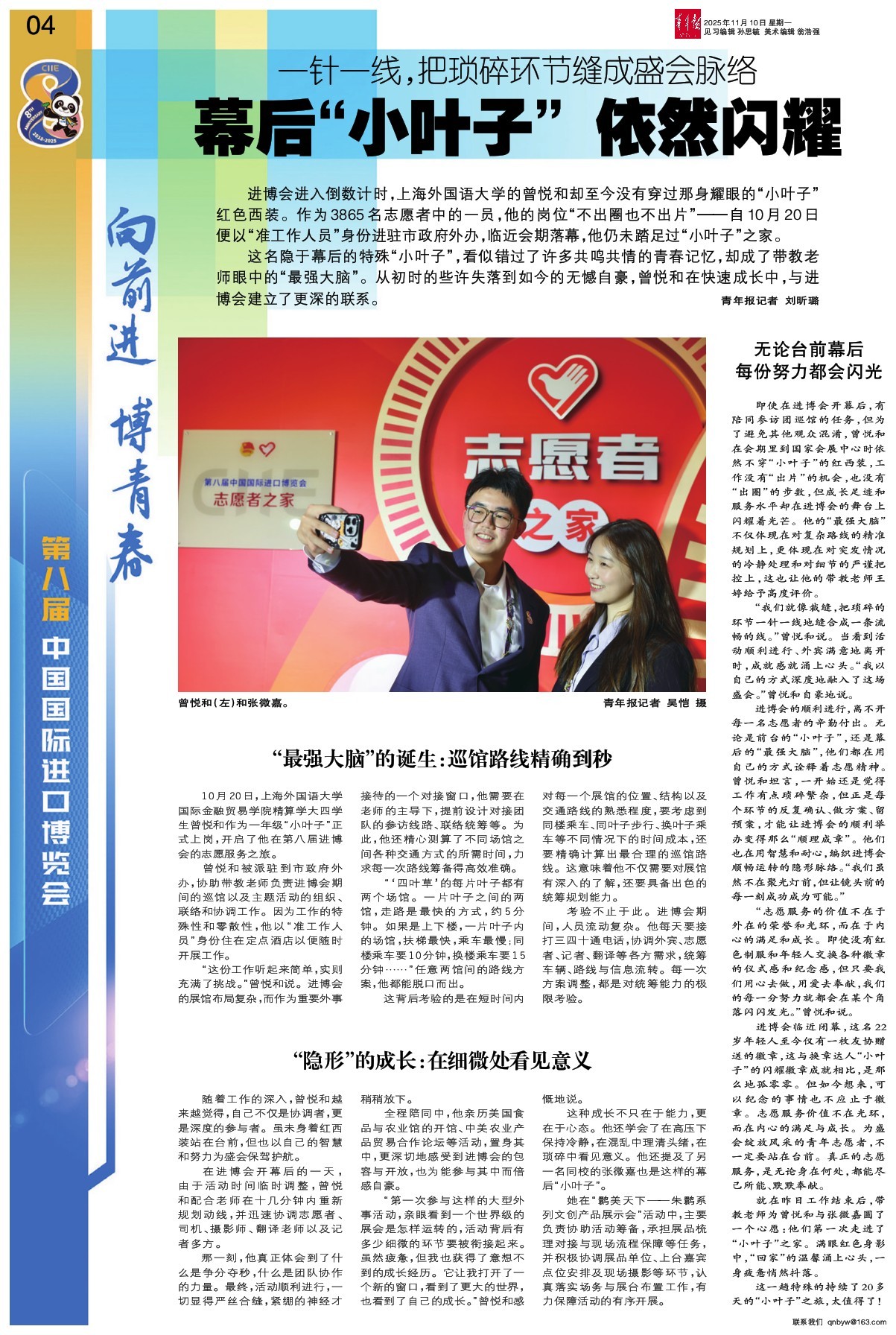 这名隐于幕后的特殊“小叶子”,看似错过了许多共鸣共情的青春记忆,却成了带教老师眼中的“最强大脑”。从初时的些许失落到如今的无憾自豪,曾悦和在快速成长中,与进博会建立了更深的联系。