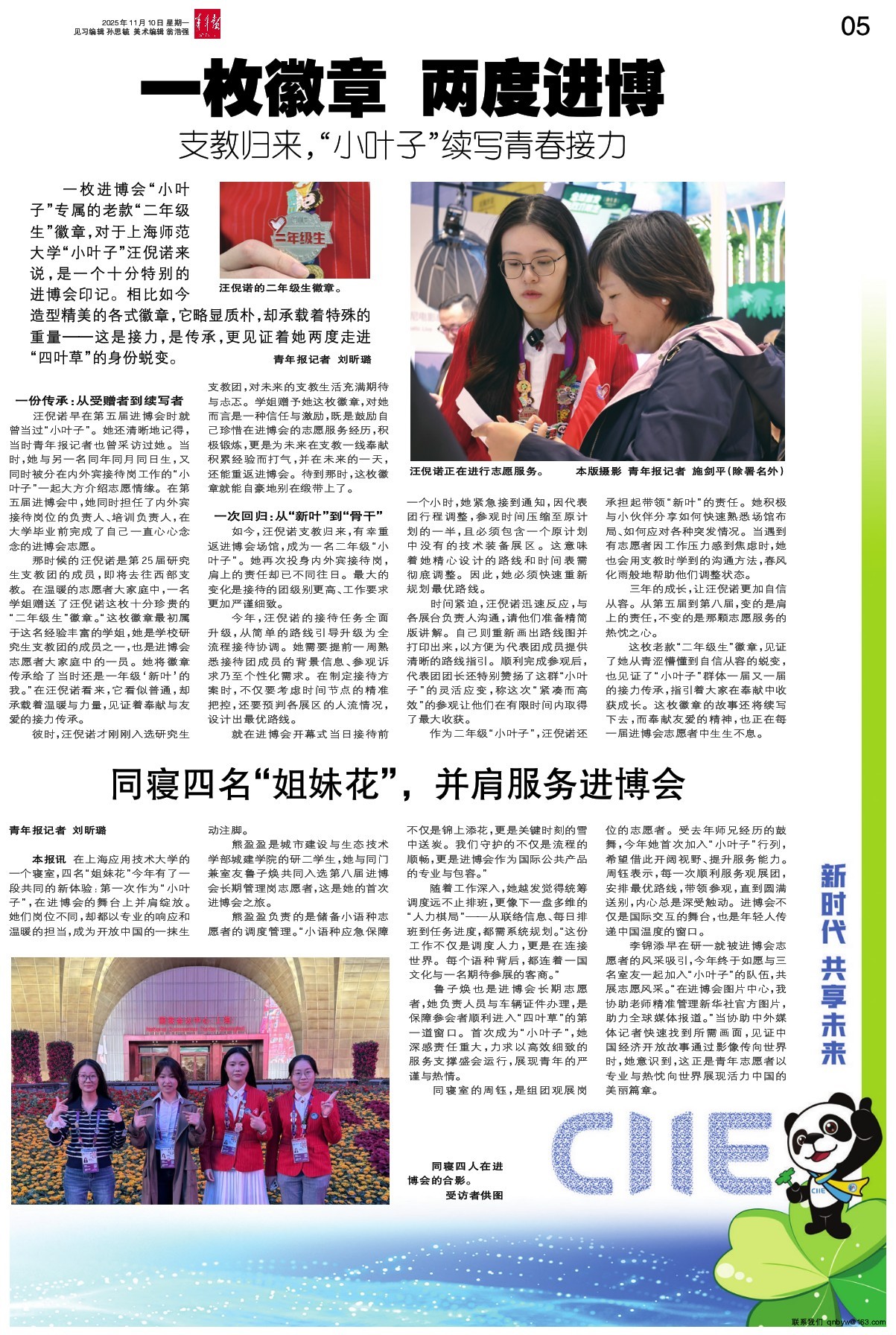 本报讯 在上海应用技术大学的一个寝室,四名“姐妹花”今年有了一段共同的新体验:第一次作为“小叶子”,在进博会的舞台上并肩绽放。她们岗位不同,却都以专业的响应和温暖的担当,成为开放中国的一抹生动注脚。