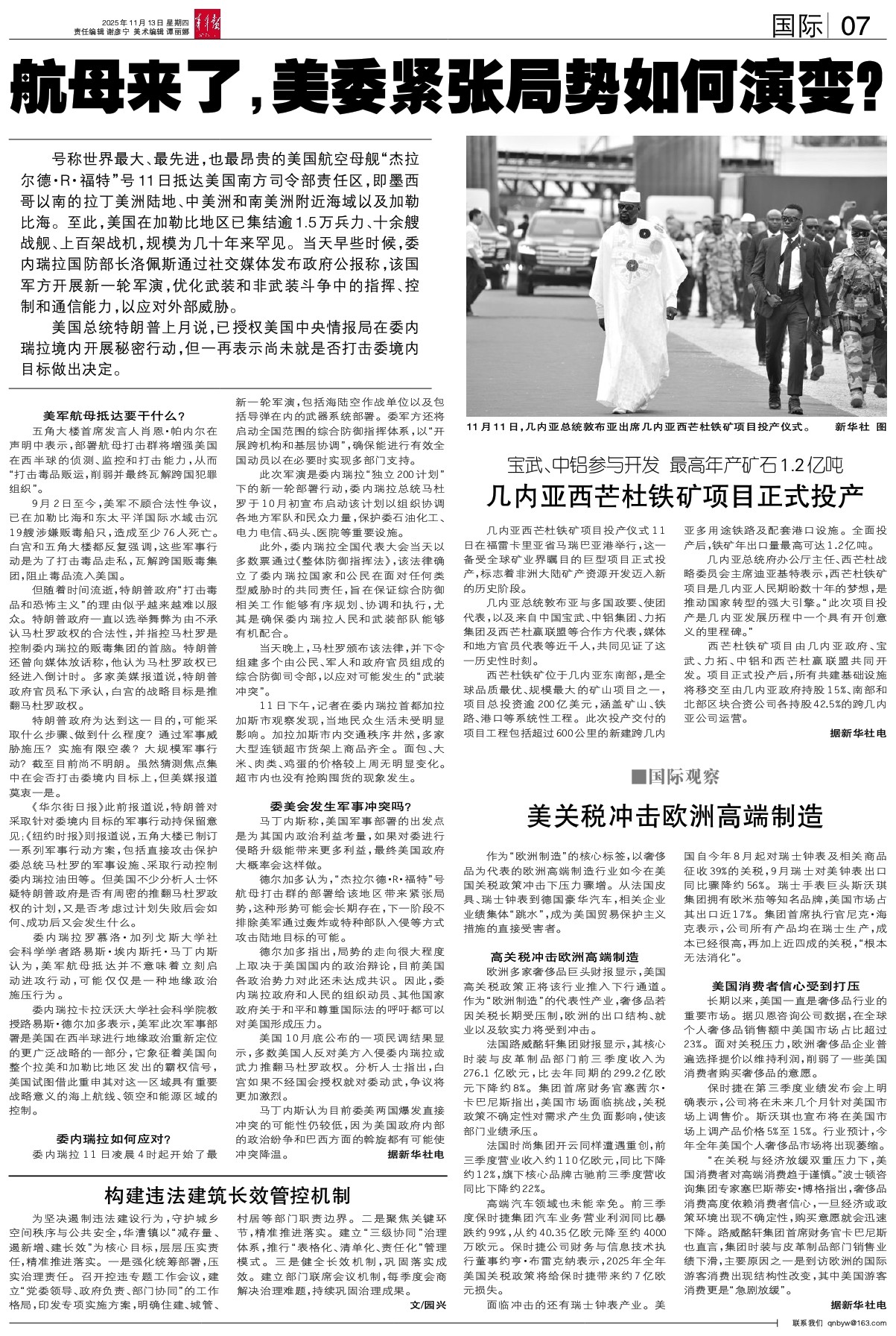号称世界最大、最先进,也最昂贵的美国航空母舰“杰拉尔德·R·福特”号11日抵达美国南方司令部责任区,即墨西哥以南的拉丁美洲陆地、中美洲和南美洲附近海域以及加勒比海。至此,美国在加勒比地区已集结逾1.5万兵力、十余艘战舰、上百架战机,规模为几十年来罕见。当天早些时候,委内瑞拉国防部长洛佩斯通过社交媒体发布政府公报称,该国军方开展新一轮军演,优化武装和非武装斗争中的指挥、控制和通信能力,以应对外部威胁。