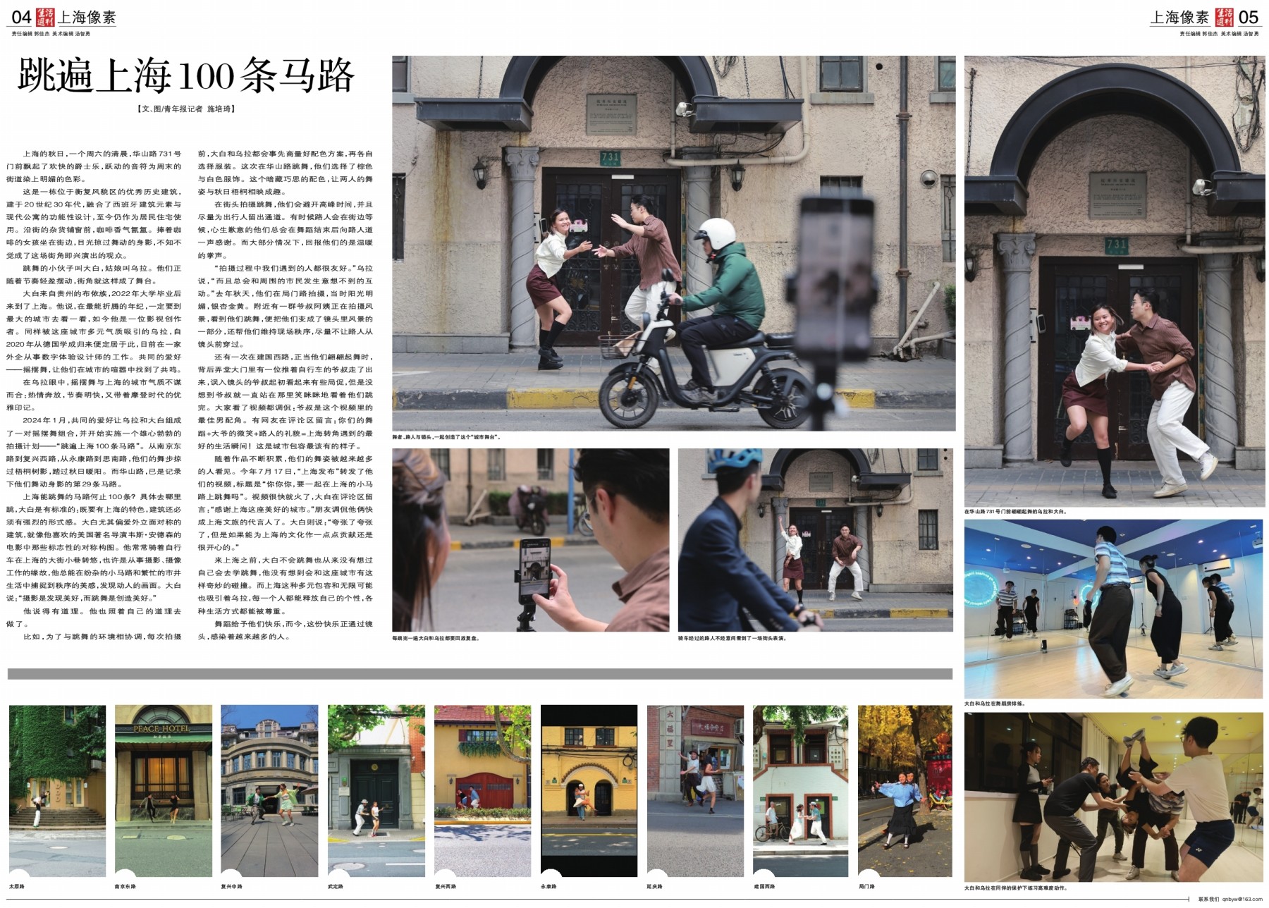2024年1月,共同的爱好让乌拉和大白组成了一对摇摆舞组合,并开始实施一个雄心勃勃的拍摄计划——“跳遍上海100条马路”。从南京东路到复兴西路,从永康路到思南路,他们的舞步掠过梧桐树影,踏过秋日暖阳。而华山路,已是记录下他们舞动身影的第29条马路。