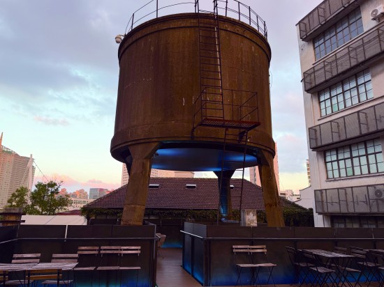 走进莫干山路50号,时间仿佛选择性地凝固了。红砖墙、钢架梁、斑驳的水泥地,信和纱厂的旧影犹在眼前。抬起头来,便能看见那座水塔。它曾是这片厂区的制高点,如今,它被赋予了一颗新的“心脏”。