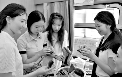 2025年5月30日,在中国—中亚国际人文旅游专列(西安—阿拉木图段)上,乘客在包粽子。新华社 图