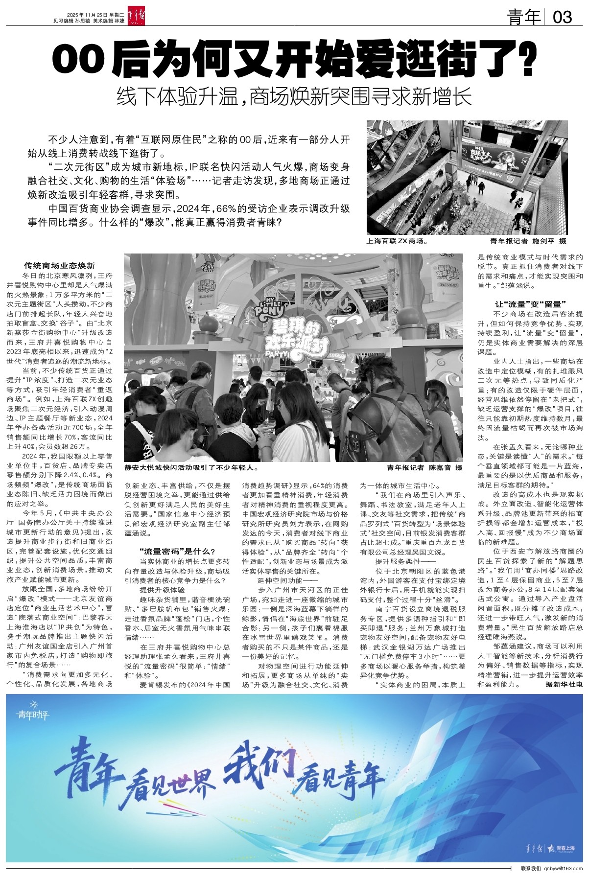 “二次元街区”成为城市新地标,IP联名快闪活动人气火爆,商场变身融合社交、文化、购物的生活“体验场”……记者走访发现,多地商场正通过焕新改造吸引年轻客群,寻求突围。
