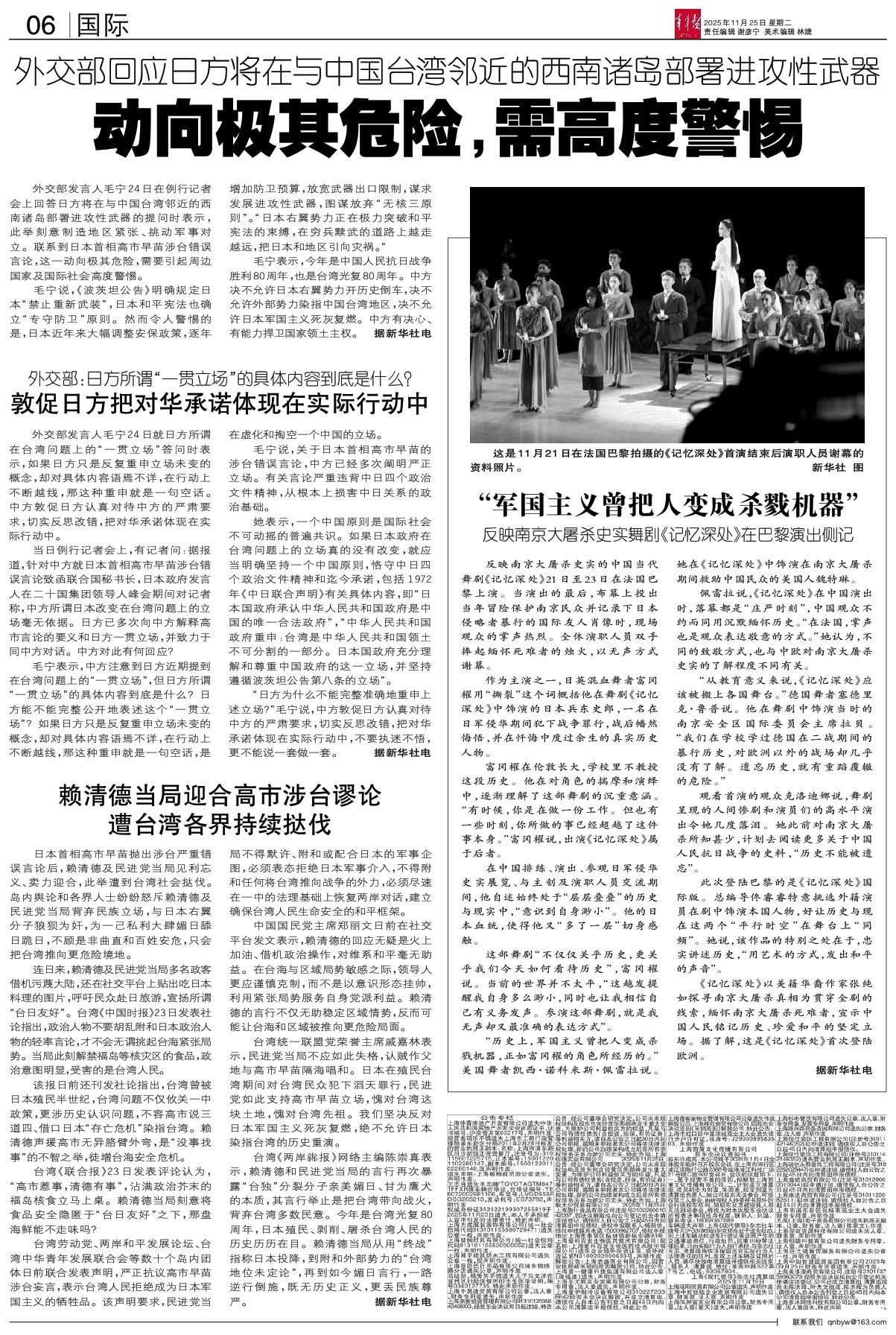 毛宁表示,今年是中国人民抗日战争胜利80周年,也是台湾光复80周年。中方决不允许日本右翼势力开历史倒车,决不允许外部势力染指中国台湾地区,决不允许日本军国主义死灰复燃。中方有决心、有能力捍卫国家领土主权。