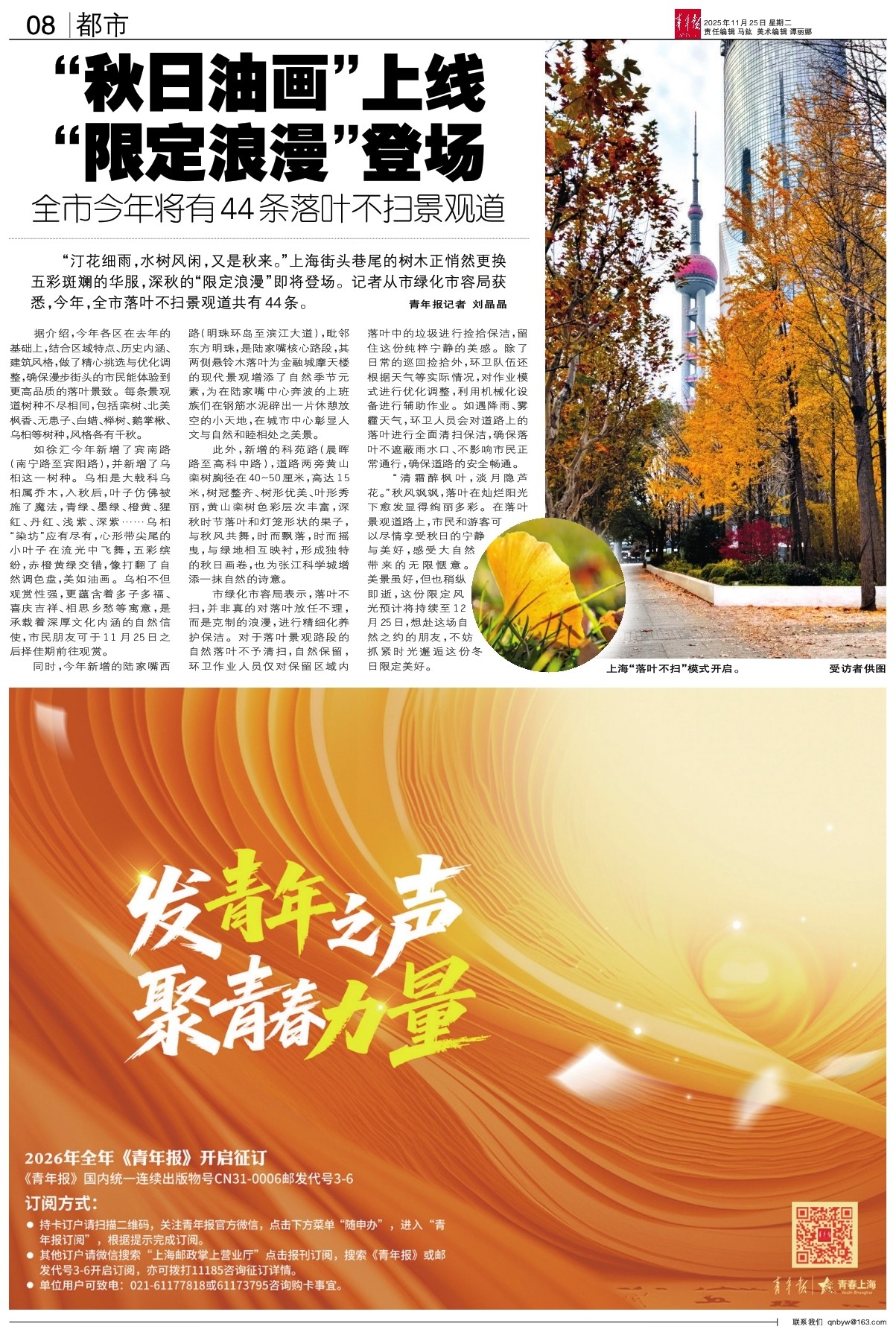 市绿化市容局表示,落叶不扫,并非真的对落叶放任不理,而是克制的浪漫,进行精细化养护保洁。对于落叶景观路段的自然落叶不予清扫,自然保留,环卫作业人员仅对保留区域内落叶中的垃圾进行捡拾保洁,留住这份纯粹宁静的美感。除了日常的巡回捡拾外,环卫队伍还根据天气等实际情况,对作业模式进行优化调整,利用机械化设备进行辅助作业。如遇降雨、雾霾天气,环卫人员会对道路上的落叶进行全面清扫保洁,确保落叶不遮蔽雨水口、不影响市民正常通行,确保道路的安全畅通。