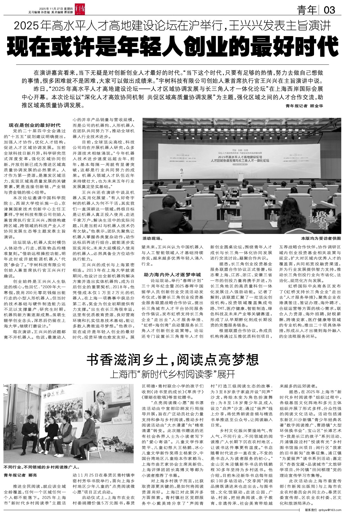 推进全民阅读,就应该全域全龄覆盖,任何一个区域任何一个人都不能落下。2025年上海市“新时代乡村阅读季”主题活动11月25日在奉贤区青村镇李窑村芳华书院举行,面向上海乡村地区少年儿童的“点亮阅读微心愿”项目正式启动。