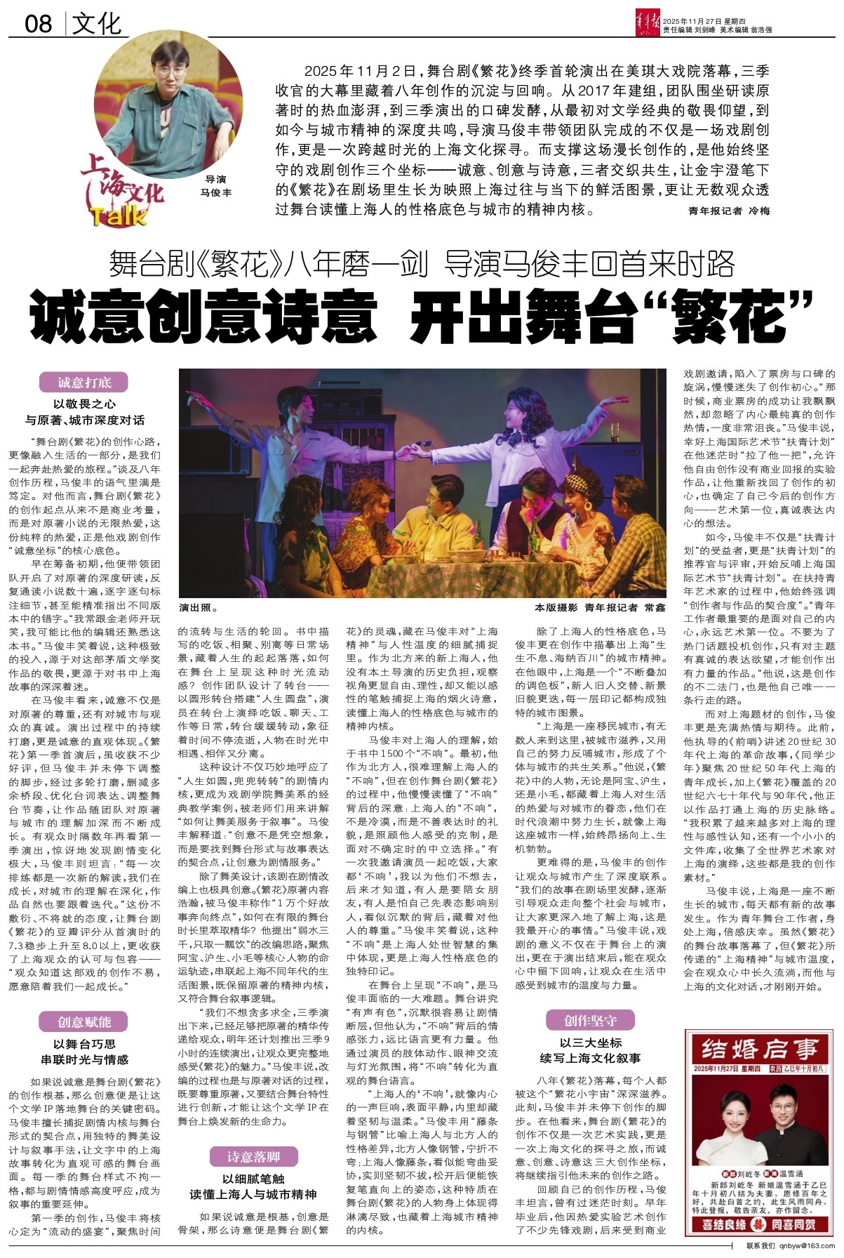 马俊丰说,上海是一座不断生长的城市,每天都有新的故事发生。作为青年舞台工作者,身处上海,倍感庆幸。虽然《繁花》的舞台故事落幕了,但《繁花》所传递的“上海精神”与城市温度,会在观众心中长久流淌,而他与上海的文化对话,才刚刚开始。