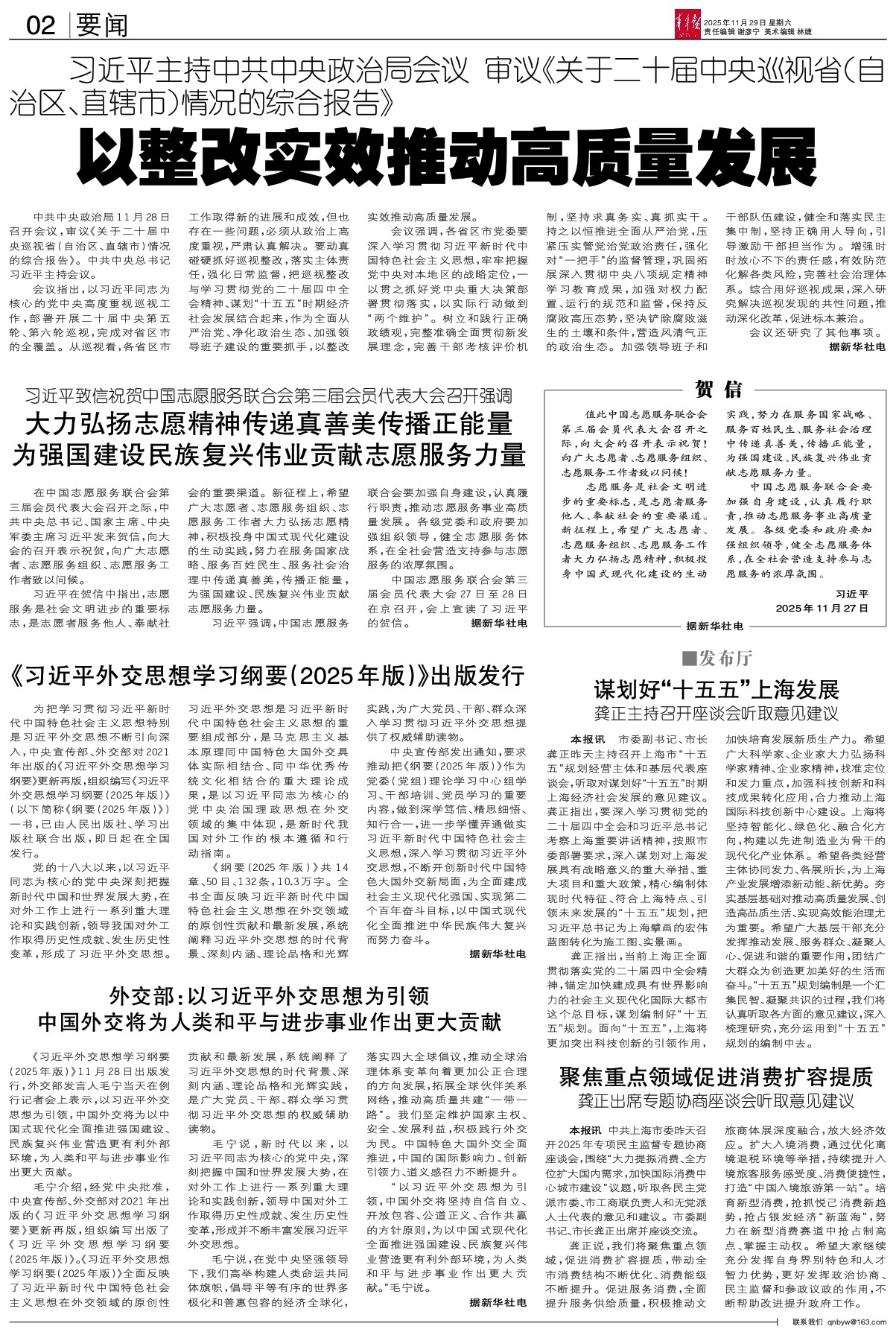 中央宣传部发出通知,要求推动把《纲要(2025年版)》作为党委(党组)理论学习中心组学习、干部培训、党员学习的重要内容,做到深学笃信、精思细悟、知行合一,进一步学懂弄通做实习近平新时代中国特色社会主义思想,深入学习贯彻习近平外交思想,不断开创新时代中国特色大国外交新局面,为全面建成社会主义现代化强国、实现第二个百年奋斗目标,以中国式现代化全面推进中华民族伟大复兴而努力奋斗。