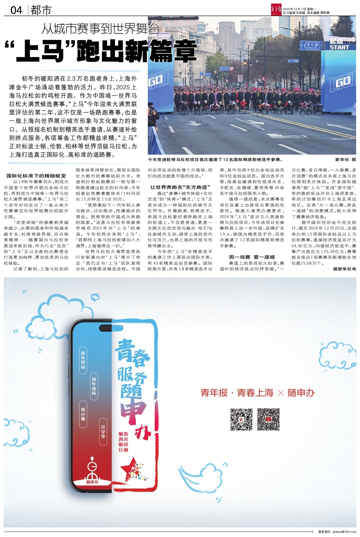 初冬的暖阳洒在2.3万名跑者身上,上海外滩金牛广场涌动着蓬勃的活力。昨日,2025上海马拉松如约鸣枪开跑。作为中国唯一世界马拉松大满贯候选赛事,“上马”今年迎来大满贯联盟评估的第二年,这不仅是一场路跑赛事,也是一扇上海向世界展示城市形象与文化魅力的窗口。从预报名机制到精英选手邀请,从赛道补给到终点服务,各项筹备工作都精益求精。“上马”正对标波士顿、伦敦、柏林等世界顶级马拉松,为上海打造真正国际化、高标准的道路赛。