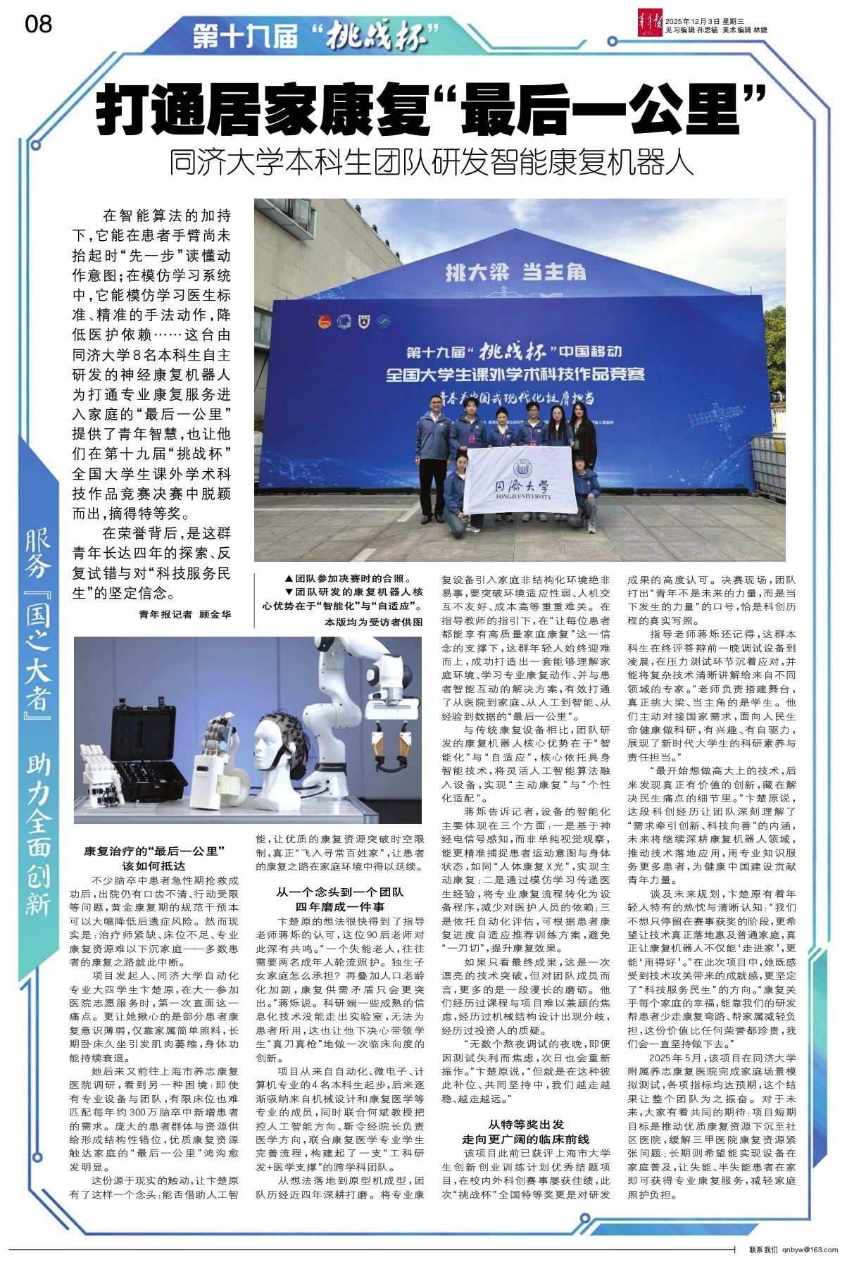 “最开始想做高大上的技术,后来发现真正有价值的创新,藏在解决民生痛点的细节里。”卞楚原说,这段科创经历让团队深刻理解了“需求牵引创新、科技向善”的内涵,未来将继续深耕康复机器人领域,推动技术落地应用,用专业知识服务更多患者,为健康中国建设贡献青年力量。