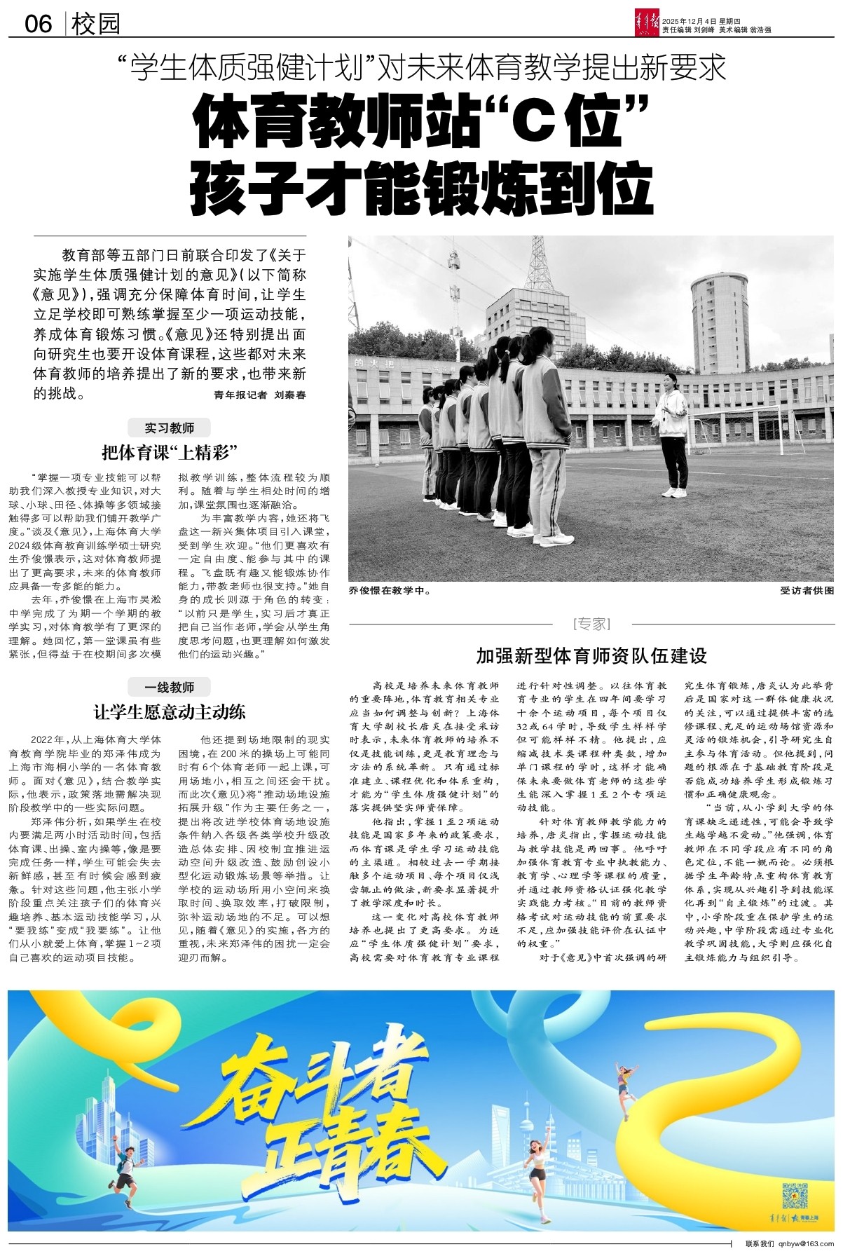 “掌握一项专业技能可以帮助我们深入教授专业知识,对大球、小球、田径、体操等多领域接触得多可以帮助我们铺开教学广度。”谈及《意见》,上海体育大学2024级体育教育训练学硕士研究生乔俊憬表示,这对体育教师提出了更高要求,未来的体育教师应具备一专多能的能力。