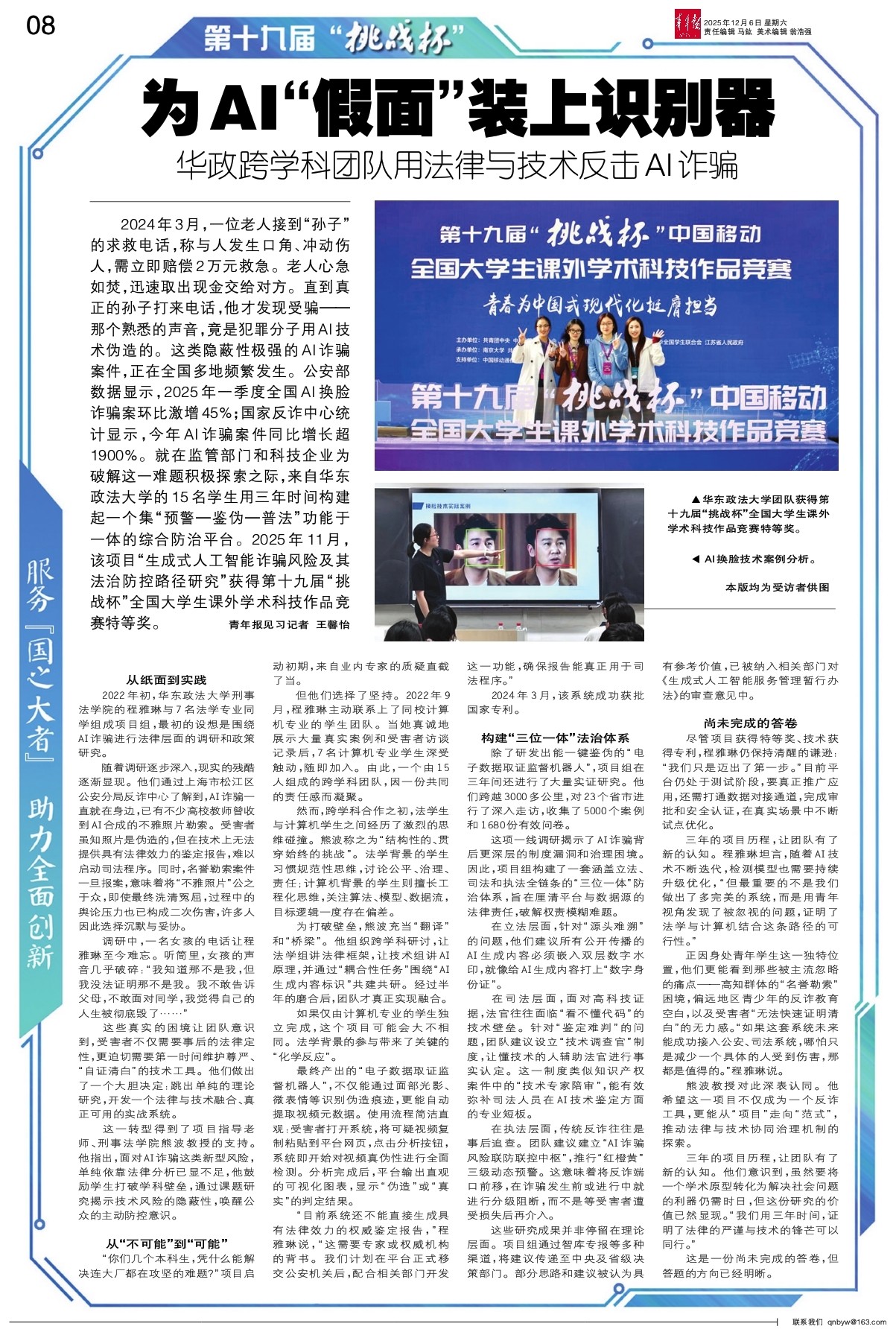 2024年3月,一位老人接到“孙子”的求救电话,称与人发生口角、冲动伤人,需立即赔偿2万元救急。老人心急如焚,迅速取出现金交给对方。直到真正的孙子打来电话,他才发现受骗——那个熟悉的声音,竟是犯罪分子用AI技术伪造的。这类隐蔽性极强的AI诈骗案件,正在全国多地频繁发生。公安部数据显示,2025年一季度全国AI换脸诈骗案环比激增45%;国家反诈中心统计显示,今年AI诈骗案件同比增长超1900%。就在监管部门和科技企业为破解这一难题积极探索之际,来自华东政法大学的15名学生用三年时间构建起一个集“预警—鉴伪—普法”功能于一体的综合防治平台。2025年11月,该项目“生成式人工智能诈骗风险及其法治防控路径研究”获得第十九届“挑战杯”全国大学生课外学术科技作品竞赛特等奖。