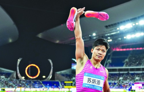 11月20日晚的全运会男子4×100米接力决赛后,当粤语歌《讲不出再见》响起,苏炳添脱下钉鞋,向观众挥手告别。