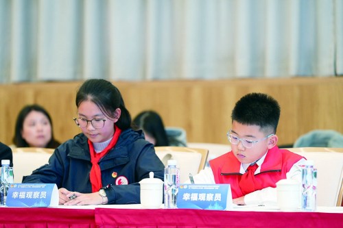 “5G时代下,还有一群‘无G’的老人,他们还是以观看电视作为信息获取渠道,然而他们因此容易被虚假广告所迷惑,陷入维权的纠纷……”活动现场,来自华东师大二附中的曾景睿、邹仪斐同学分享了《关于传统电视台直播频道适老化消费保护机制》的模拟提案。身边的其他几名青少年正在认真倾听,不时记录笔记,他们是来自浦东中小学的“幸福观察员”代表。