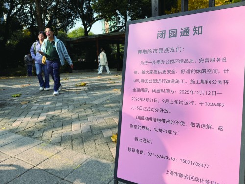 昨天是静安公园闭园前的最后一天,中午时分,记者来到公园门口,发现大门口摆放了“施工闭园”的告示。