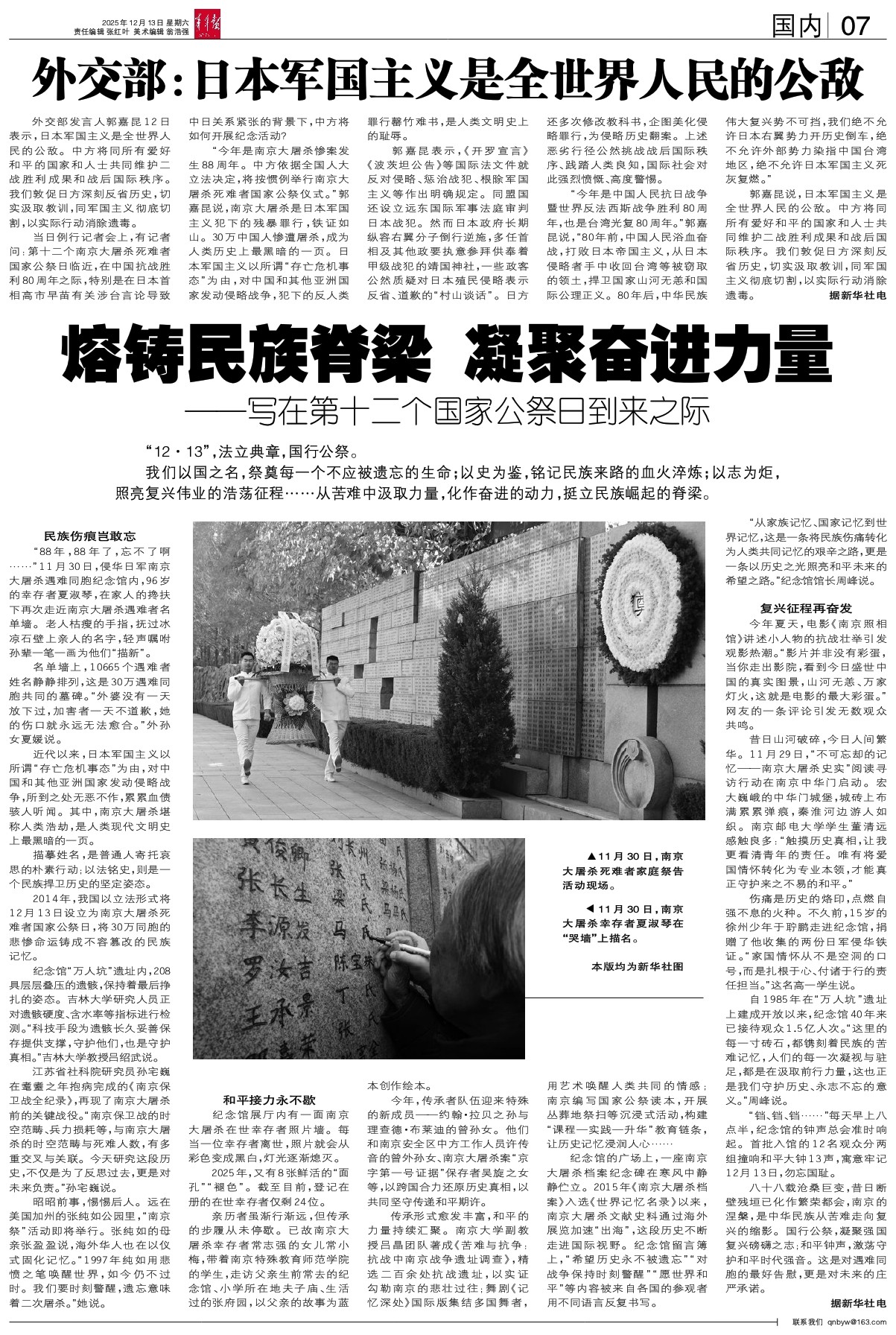 2014年,我国以立法形式将12月13日设立为南京大屠杀死难者国家公祭日,将30万同胞的悲惨命运铸成不容篡改的民族记忆。