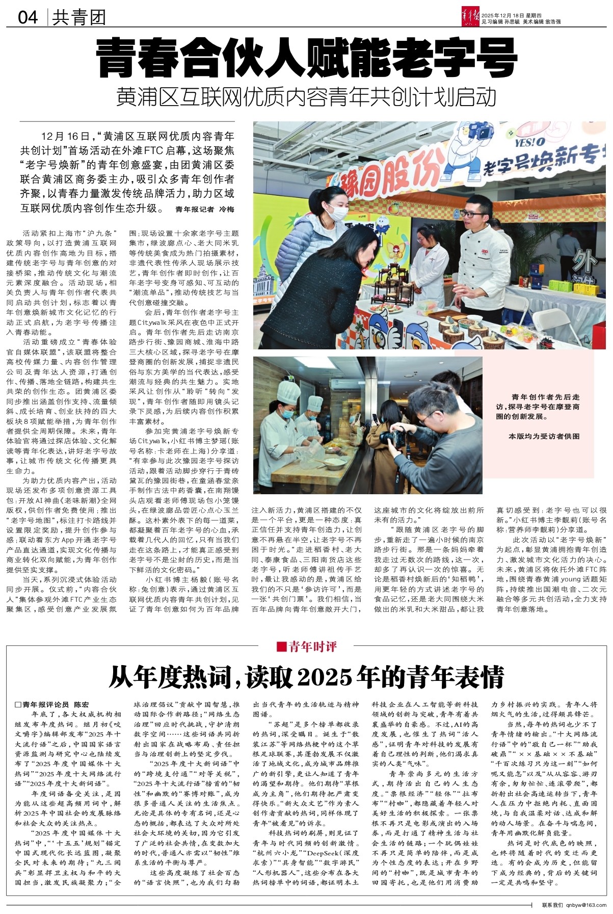 12月16日,“黄浦区互联网优质内容青年共创计划”首场活动在外滩FTC启幕,这场聚焦“老字号焕新”的青年创意盛宴,由团黄浦区委联合黄浦区商务委主办,吸引众多青年创作者齐聚,以青春力量激发传统品牌活力,助力区域互联网优质内容创作生态升级。