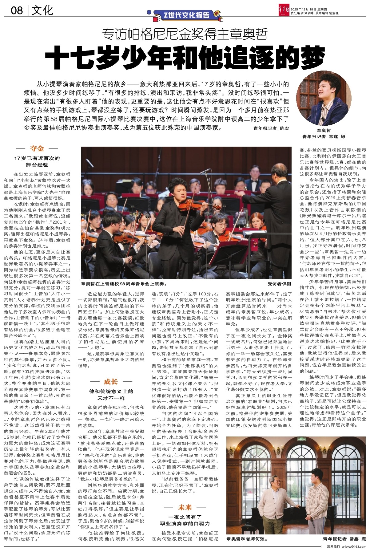接受本报专访前,章奥哲正在向何弦教授汇报:“帕格尼尼赛事组委会那边来邮件了,定了明年欧洲巡演的时间。”两个人开始盘算起时间来——对尚未成年的章奥哲来说,年少成名,意味着学业和职业的冲突在所难免。