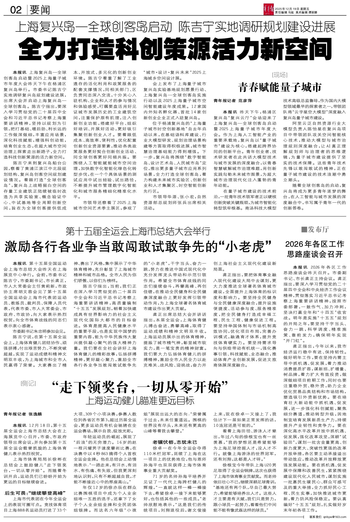 陈吉宁指出,当前,我们正在深入学习贯彻党的二十届四中全会和习近平总书记考察上海重要讲话精神,高质量编制“十五五”发展规划,朝着加快建成具有世界影响力的社会主义现代化国际大都市的目标奋进。体育是提高人民健康水平的重要手段,也是实现中国梦的重要内容,能为中华民族伟大复兴提供凝心聚气的强大精神力量。我们要在全社会讲好上海体育健儿的精彩故事,弘扬拼搏精神,更好凝心聚力,激励全市各行各业争当敢闯敢试敢争先的“小老虎”,干字当头、奋力一跳,努力在推进中国式现代化中充分发挥龙头带动和示范引领作用。希望全市体育战线的同志们接续奋斗,再攀高峰、再创佳绩,在推动全民健身和全民健康深度融合上更好发挥引领带动作用,为上海全球著名体育城市建设作出更大贡献。