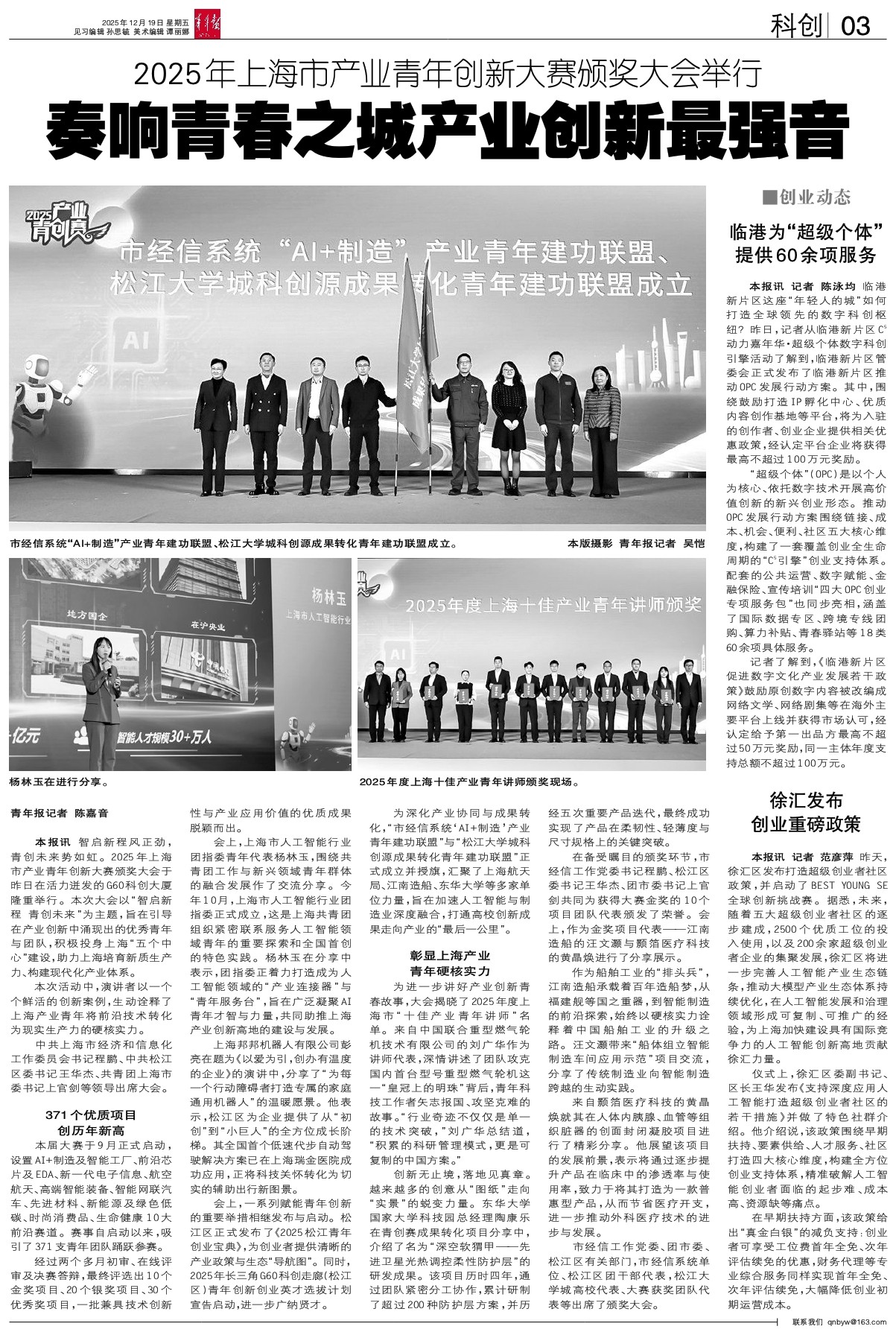 市经信系统“AI+制造”产业青年建功联盟、松江大学城科创源成果转化青年建功联盟成立。本版摄影 青年报记者 吴恺