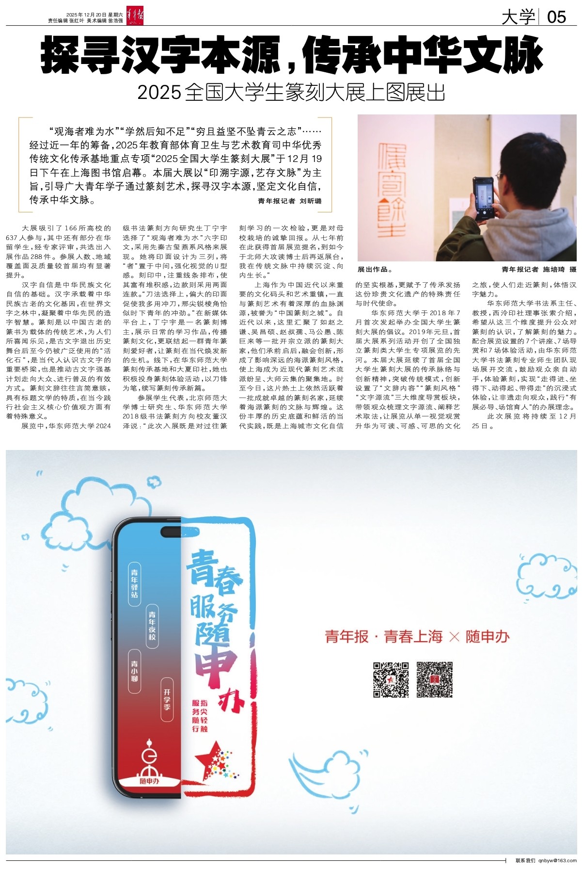 “观海者难为水”“学然后知不足”“穷且益坚不坠青云之志”……经过近一年的筹备,2025年教育部体育卫生与艺术教育司中华优秀传统文化传承基地重点专项“2025全国大学生篆刻大展”于12月19日下午在上海图书馆启幕。本届大展以“印溯字源,艺存文脉”为主旨,引导广大青年学子通过篆刻艺术,探寻汉字本源,坚定文化自信,传承中华文脉。
