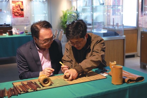 侯旭辉自知短板,近来一有空就埋头练习古朴的中山篆。对他而言,做竹刻是一体两面:“一头是为了谋生,一头是为了不断学习。”他知道,当代年轻人肯定不缺学习技术的路径和方法,缺的是古人那种文化修养和全面沉浸其中的心境。