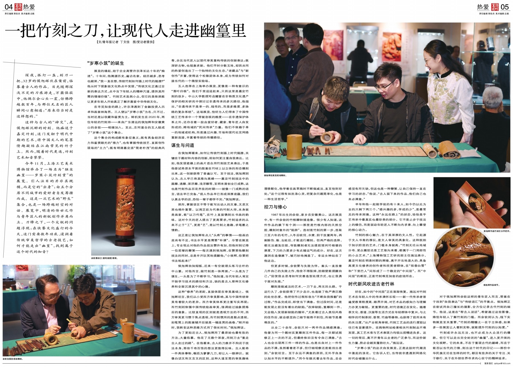 对于侯旭辉和余钦这样的青年匠人而言,答案在于找到“自我表达”与“传统语汇”的平衡点。侯旭辉正在尝试用自己擅长的摄影,全方位记录古代竹刻的细节。他说,这是在“帮古人说话”,希望通过这些影像,降低年轻人了解竹刻的门槛。而余钦则认为,线下实物展览至关重要,“竹刻的精髓之一在于立体感,如果多一些展览让人看到实物,就能提升竹刻的认知度。”